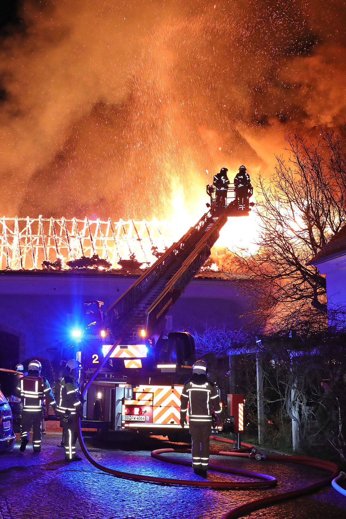 - Mit mehreren Strahlrohren und einem Großaufgebot ist die Feuerwehr im Löscheinsatz