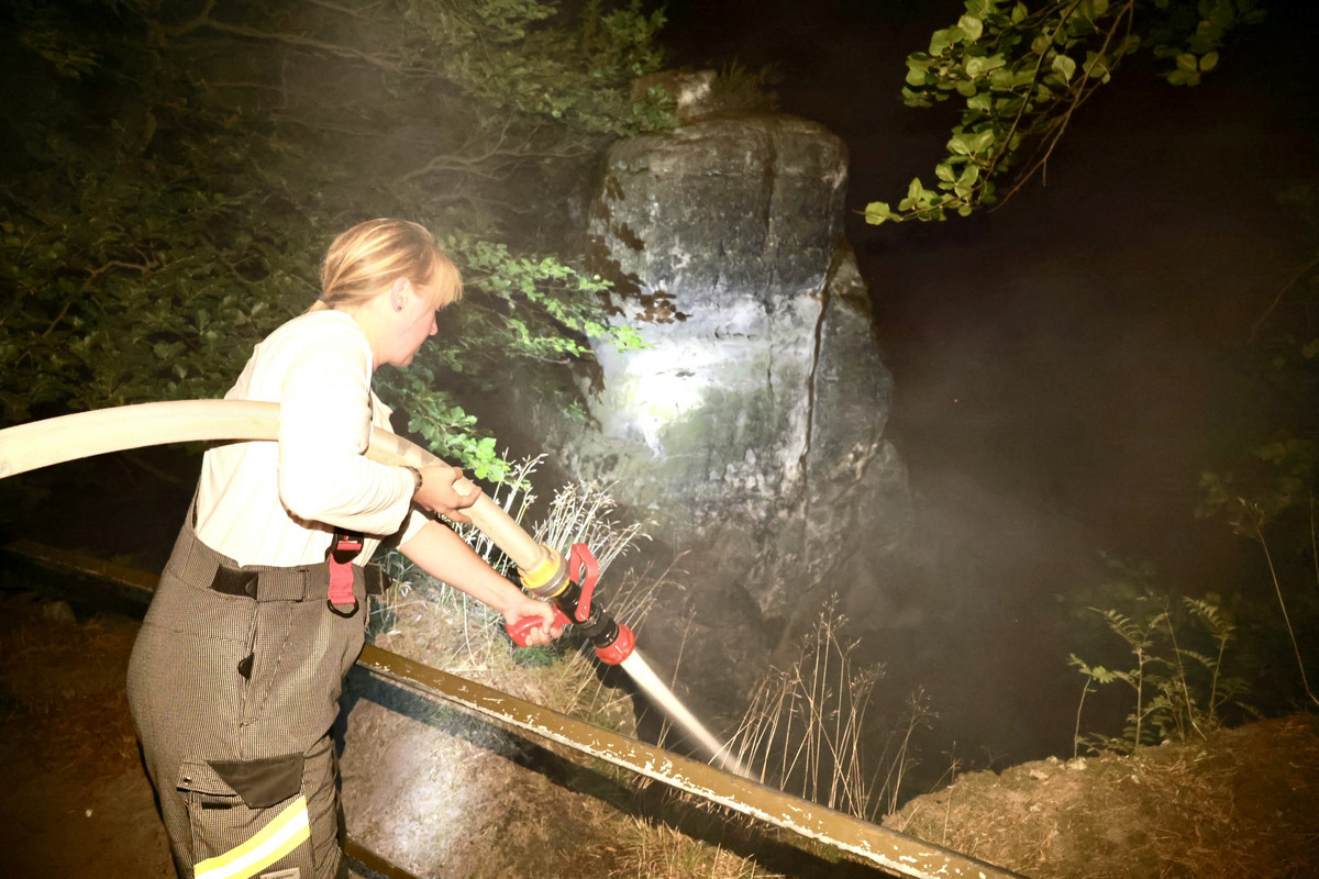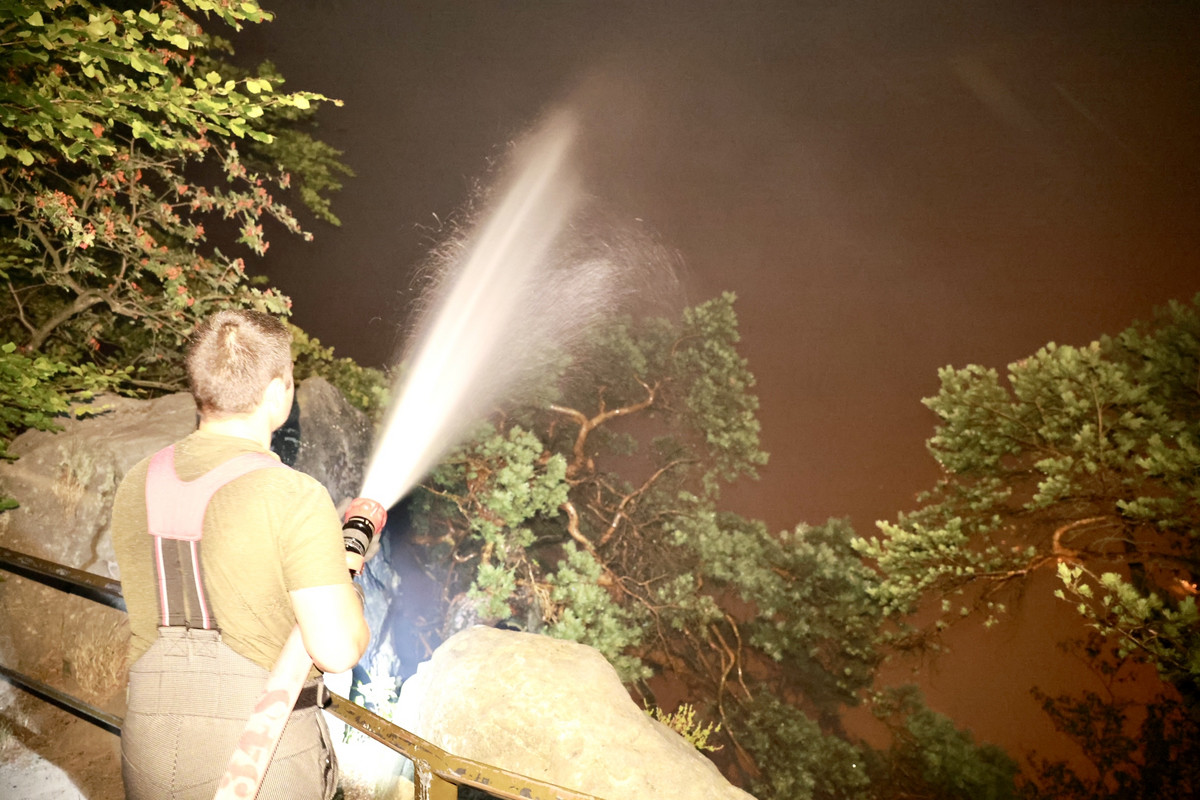 Im Nationalpark Sächsische Schweiz ist die Feuerwehr seit der Nacht zu Montag im Großeinsatz. Unterhalb der Basteibrücke wurde gegen 0:30 Uhr ein Feuer gemeldet. In dem steilen Gelände war ein Wald- bzw. Waldbodenbrand ausgebrochen. Die Feuerwehr versuchte von unten und von oben zu löschen, dabei kam auch die Höhenrettung der Freiwilligen Feuerwehr Heidenau zum Einsatz.