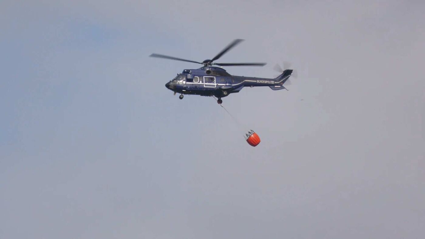 Insgesamt war demnach eine Fläche von 150 Hektar betroffen. Neben der Feuerwehr waren auch Einsatzkräfte des Technischen Hilfswerkes (THW) und ein Löschhubschrauber vor Ort im Einsatz. Rund 54.000 Liter Wasser warf der Hubschrauber laut Bundespolizei zum Löschen der Flammen ab. Die Ermittlungen der Polizei wegen Brandstiftung dauern demnach an. (dpa)