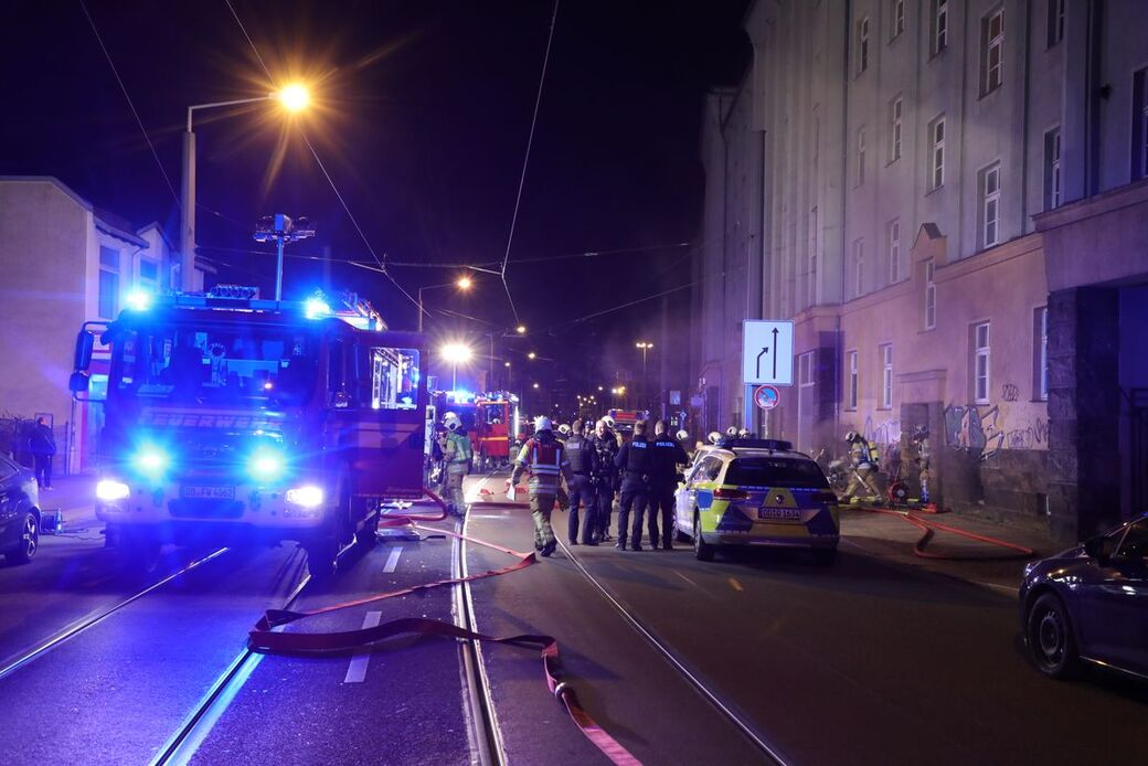 Die Leipziger Straße wurde zwischen Wüllnerstraße und Dreyßigplatz wegen des Feuerwehreinsatzes für Autos und auch Straßenbahnen gesperrt.