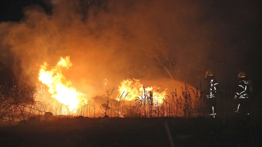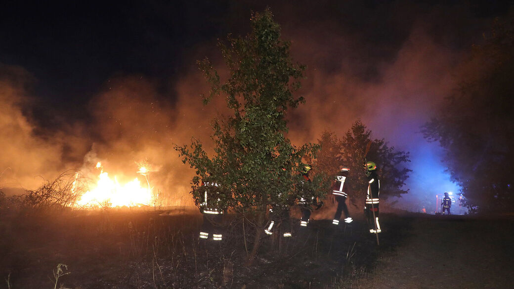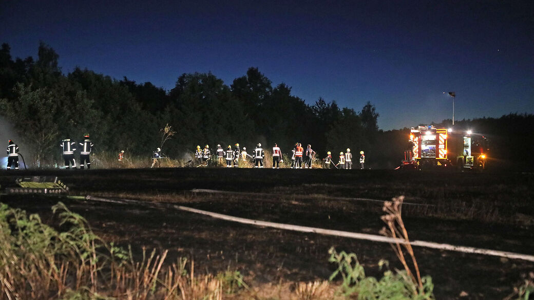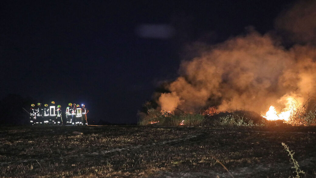 Feuerwehrleute konnten erfolgreich verhindern, daß das Feuer auf ein Wäldchen übergriff. Mit mehreren Strahlrohren, mit Wasser und Schaum