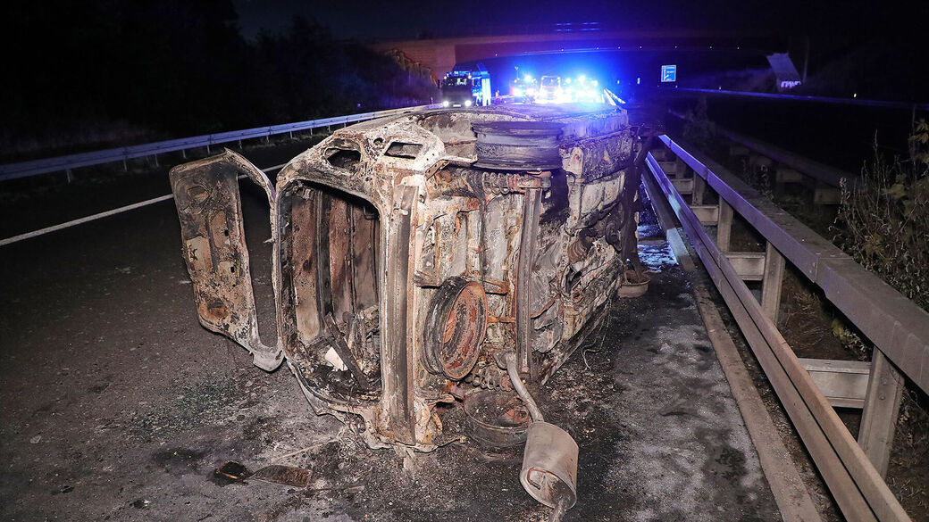 Beim Auffahren auf die Leitplanke entzündete der Toyota auch den Straßengraben. Das Feuer griff auf ein benachbartes Feld über. Die