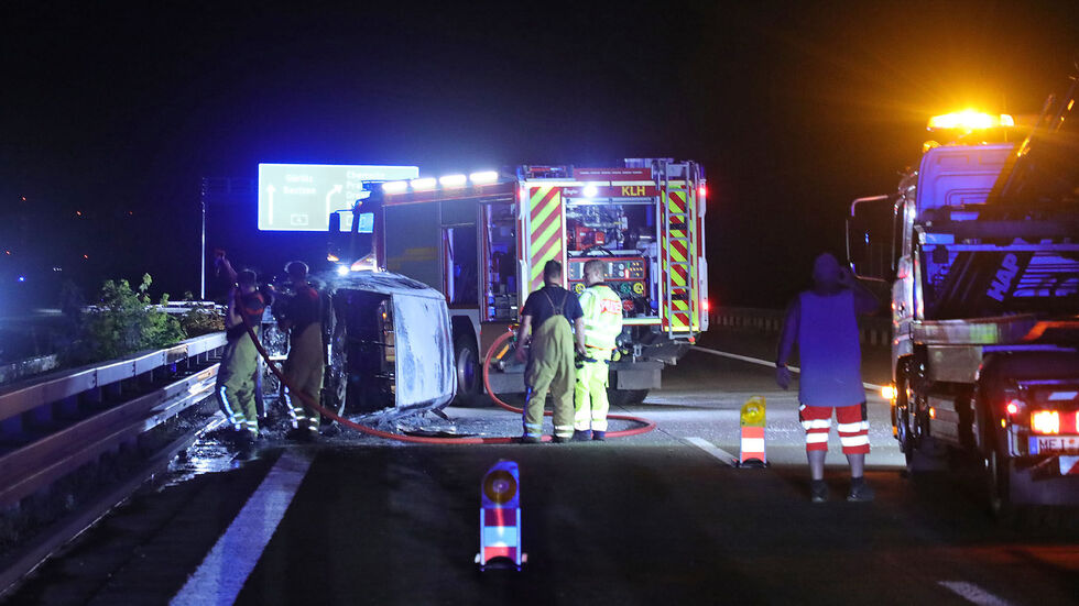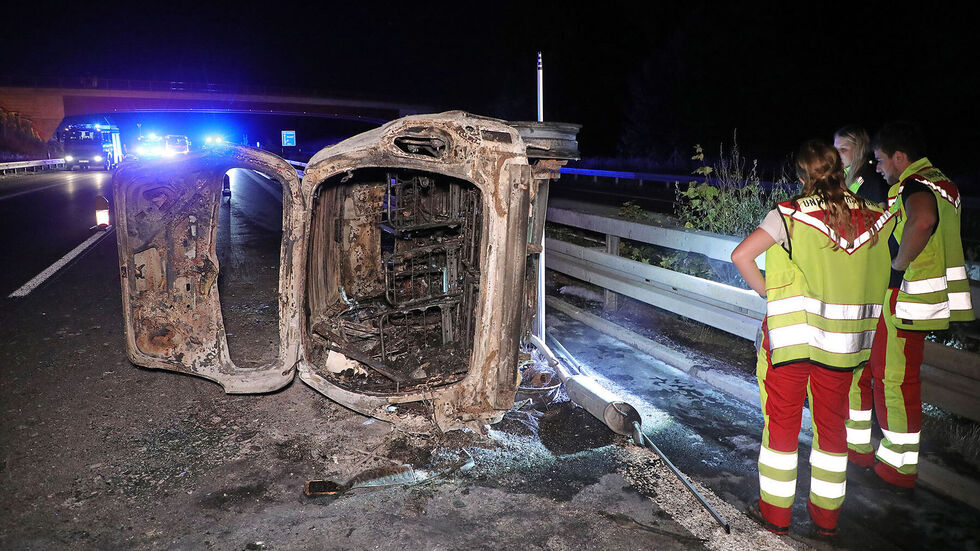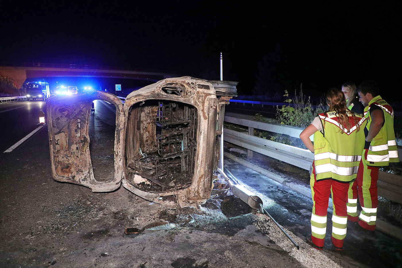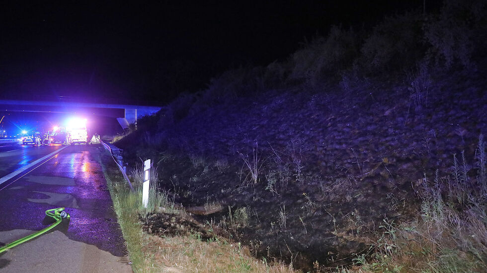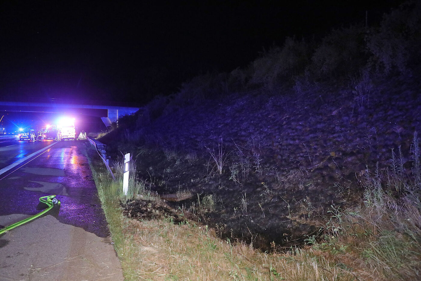 Beim Auffahren auf die Leitplanke entzündete der Toyota auch den Straßengraben. Das Feuer griff auf ein benachbartes Feld über. Die