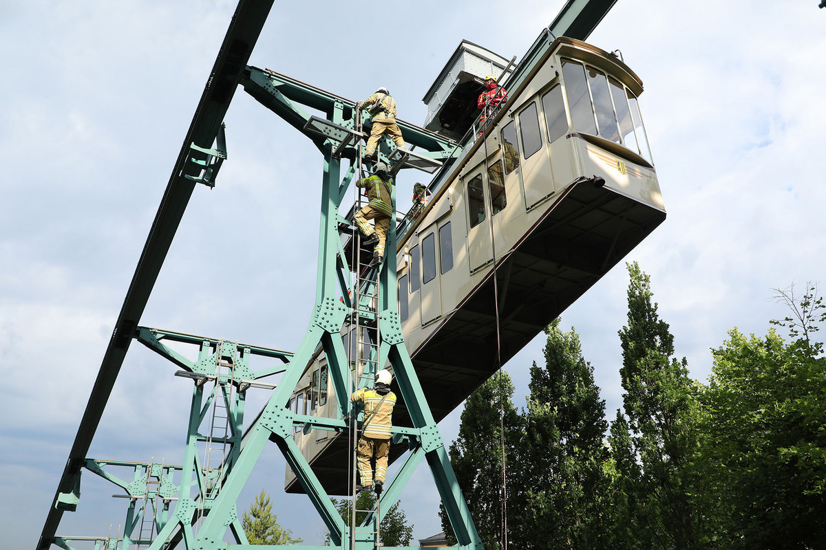 Die Dresdner Berufsfeuerwehr hat am Donnerstag an der Schwebebahn für den Ernstfall trainiert. Auf halber Strecke übten die Kameraden der Wache Striesen und die Höhenretter der Wache Löbtau die Personenrettung.