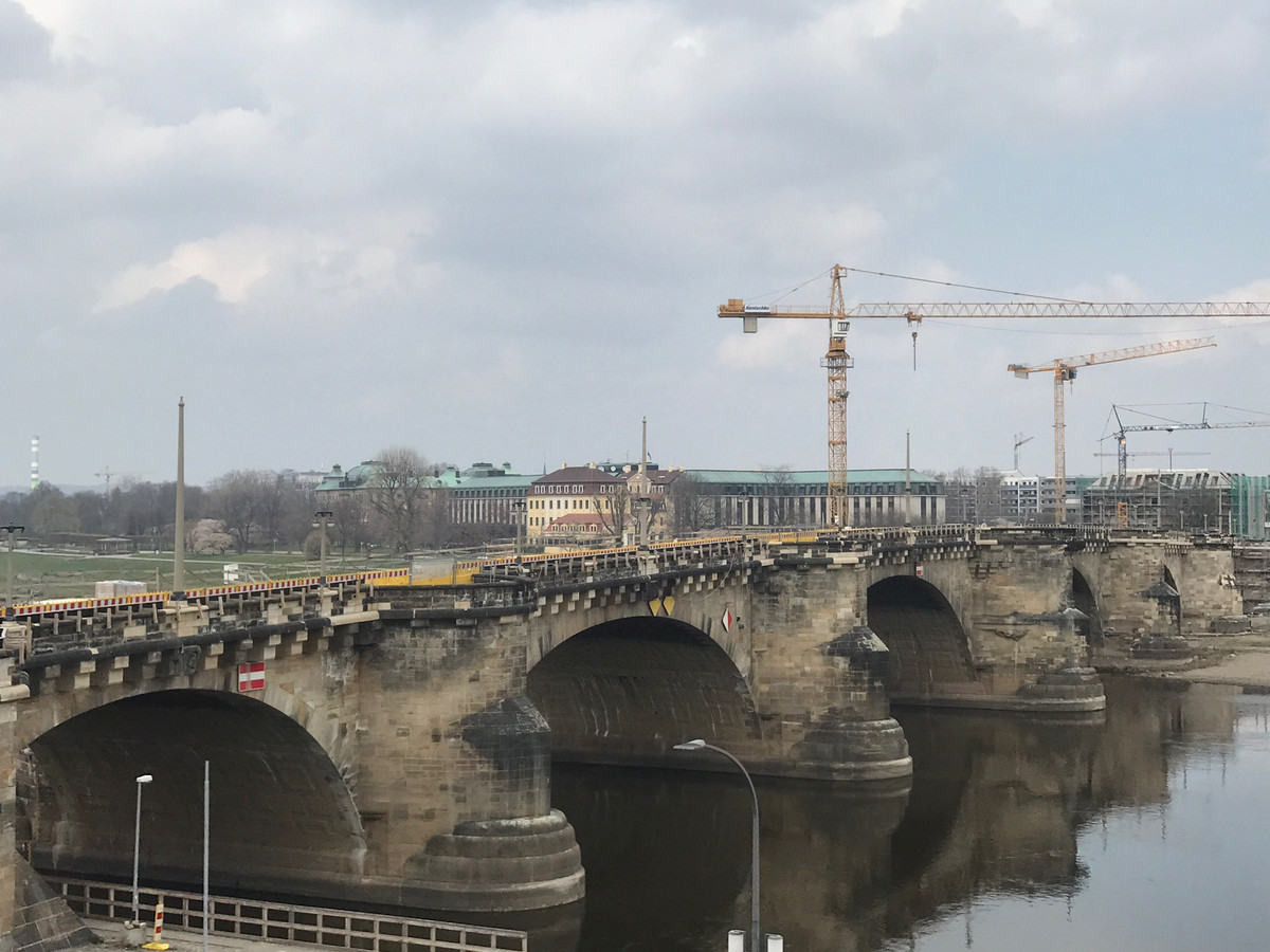 Die Bauarbeiten auf der Augustusbrücke gehen in die Endphase. In dieser Woche wollen die Dresdner Verkehrsbetriebe die letzten Fahrleitungen für die Straßenbahn montieren. Weil dafür der Strom abgeschaltet werden muss, fahren die Linien 8 und 9 anders und halten nicht am Neustädter Markt.