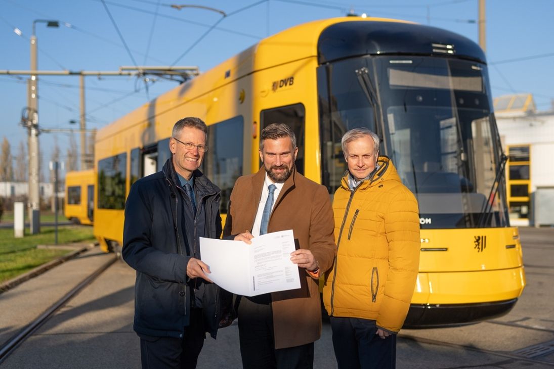 Verkehrsminister Martin Dulig brachte den Fördermittelbescheid persönlich nach Gorbitz und übergab ihn an DVB-Vorstand Andreas Hemmersbach. Der Umbau und die Anpassung der Werkstätten ist für die neuen Straßenbahnen der nächsten Generation erforderlich.