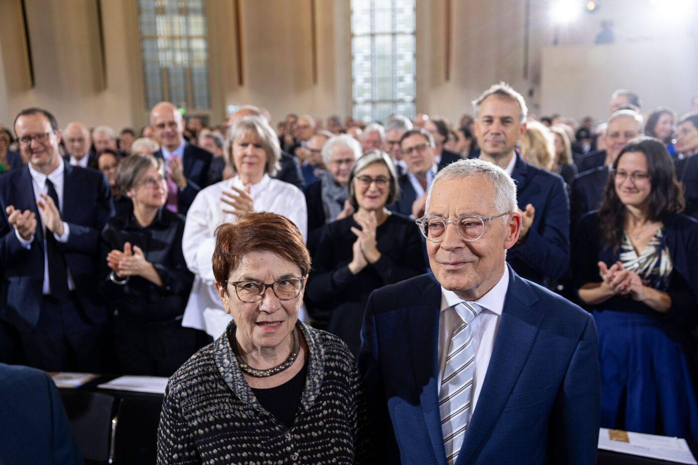In ihrer Laudatio schilderte die ukrainisch-deutsche Schriftstellerin Katja Petrowskaja, wie sie Schlögel 2022, wenige Tage nach dem Angriff Russlands auf die Ukraine, auf einer Demo in Berlin traf, eingehüllt in eine ukrainische Flagge. „Ihre öffentliche Verzweiflung hat uns damals sehr geholfen, wie auch Ihre Fähigkeit, sich aufzurichten und weiterzumachen, trotz allem. Wir wussten: Wir sind nicht allein. Danke, dass Sie sich immer wieder zu Wort melden.“