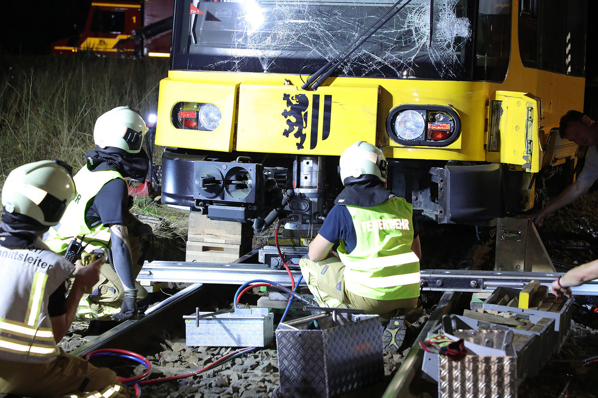 Die Feuerwehr hob mit hydraulischer Technik die 34,5 Tonnen schwere Bahn wieder auf das Gleis. Anschließend installierten die Kameraden ein Notlaufgestell unter das defekte Fahrgestell der Straßenbahn. Für die Bergungsarbeiten war der Linienbetrieb unterbrochen. An der Bahn entstand erheblicher Sachschaden. Das Auto ist Schrott.