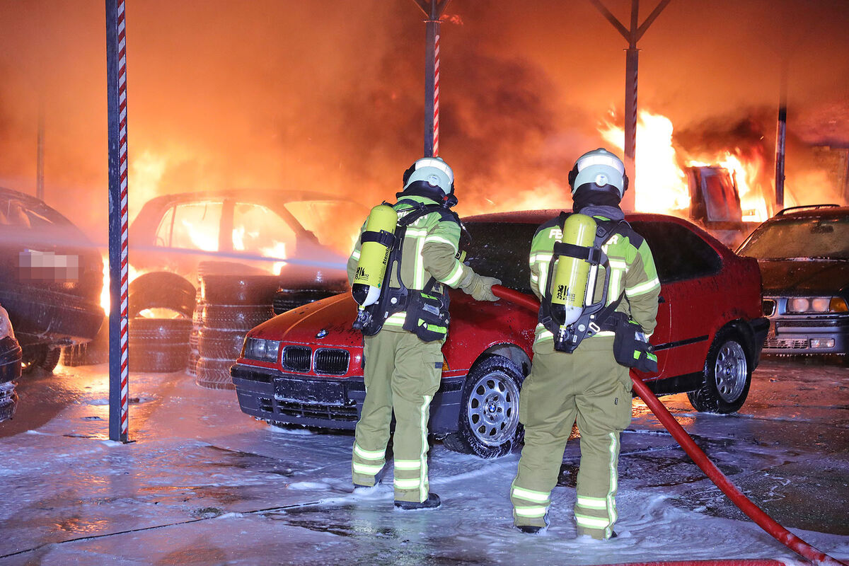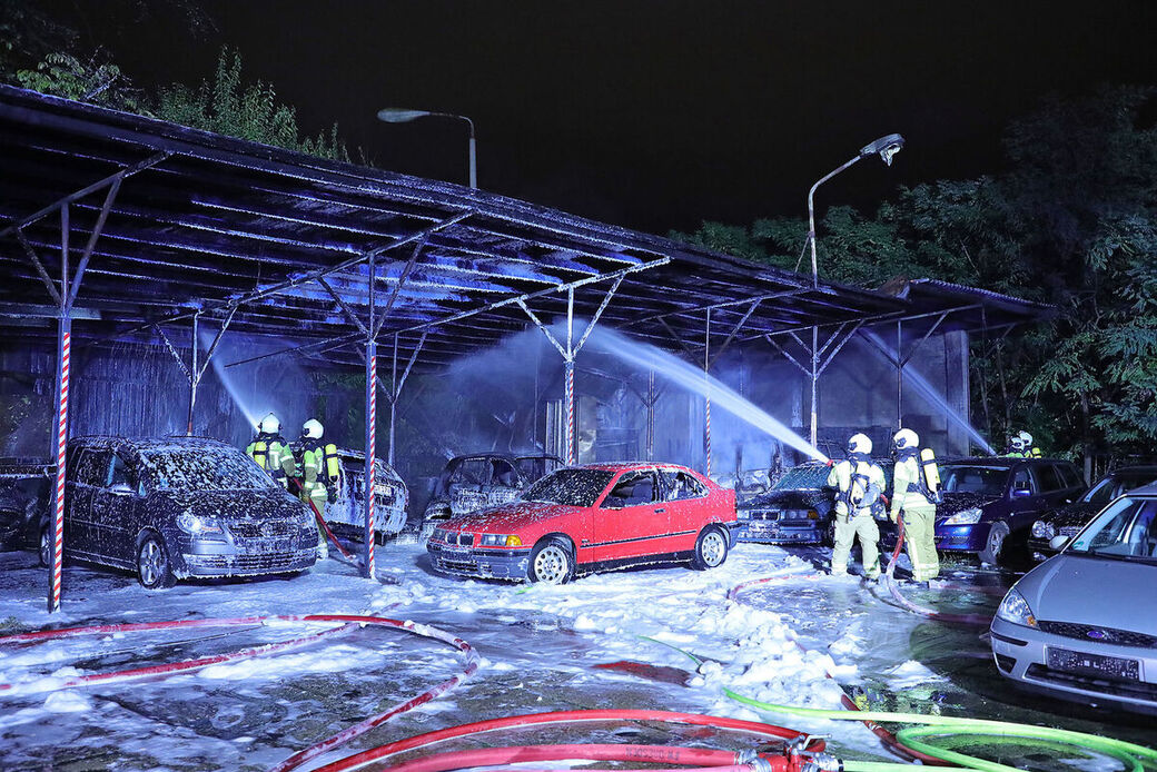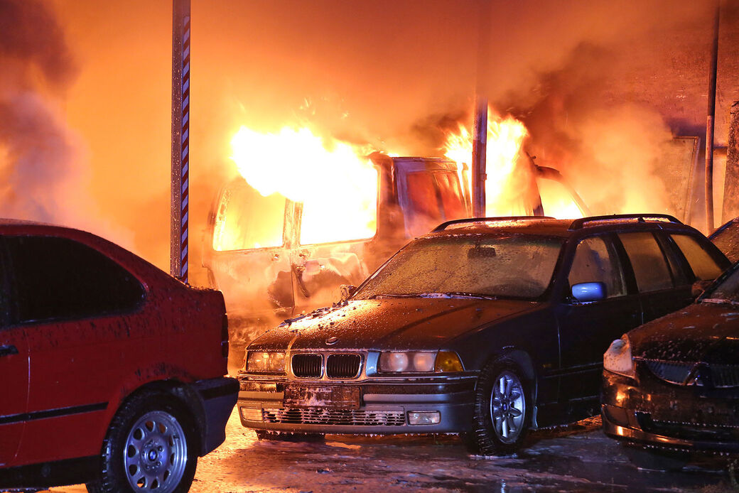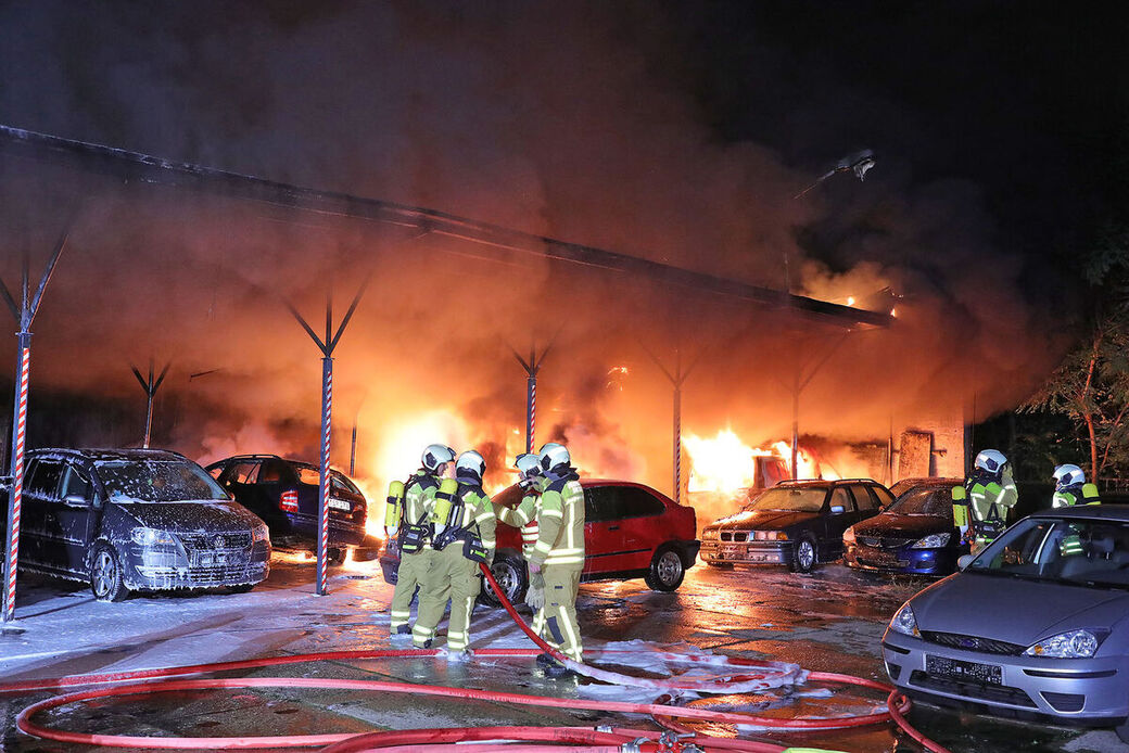 Die Feuerwehr löschte zeitweise mit vier Strahlrohren gleichzeitig. 62 Kameraden waren vor Ort. Verletzt wurde bei dem Brand niemand. Kurz nach Mitternacht war der Einsatz beendet.Insgsamt sieben Autos und ein Motorrad wurden in Mitleidenschaft gezogen.