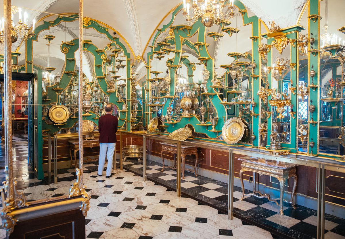 - Ein Besucher schaut sich im Juwelenzimmer des Historischen Grünen Gewölbes im Residenzschloss um. Rund drei Jahre nach dem Einbruch in das Grüne Gewölbe in Dresden haben die Ermittler einen Großteil der Beute gefunden.