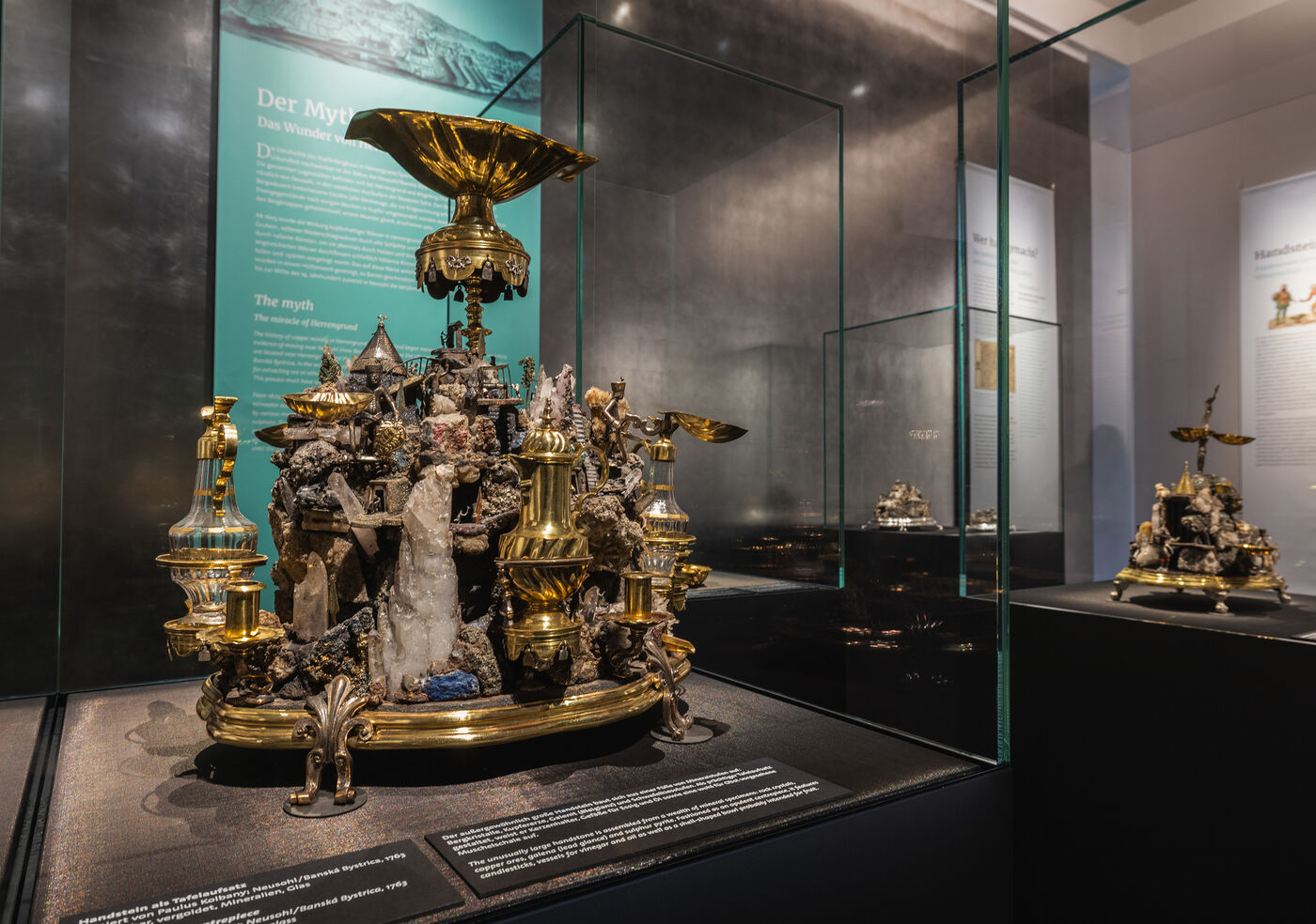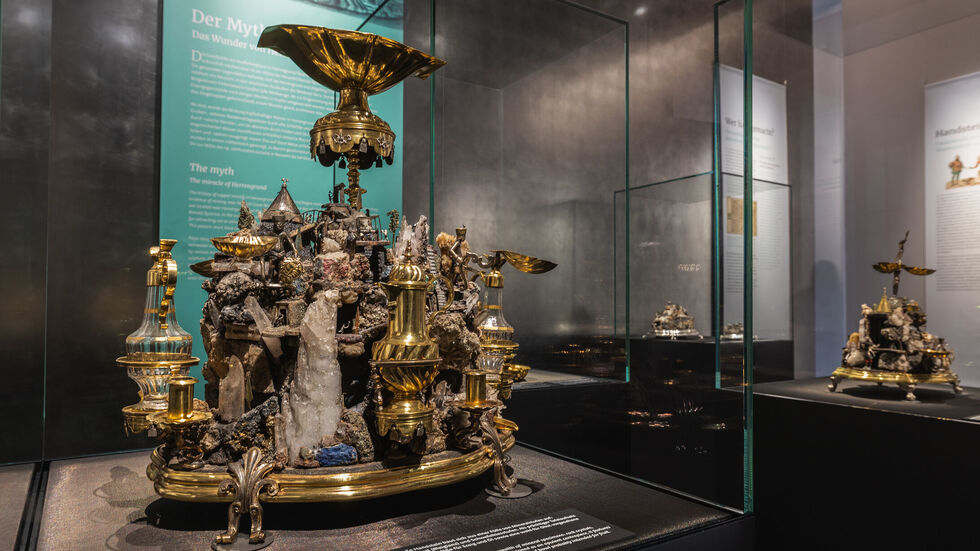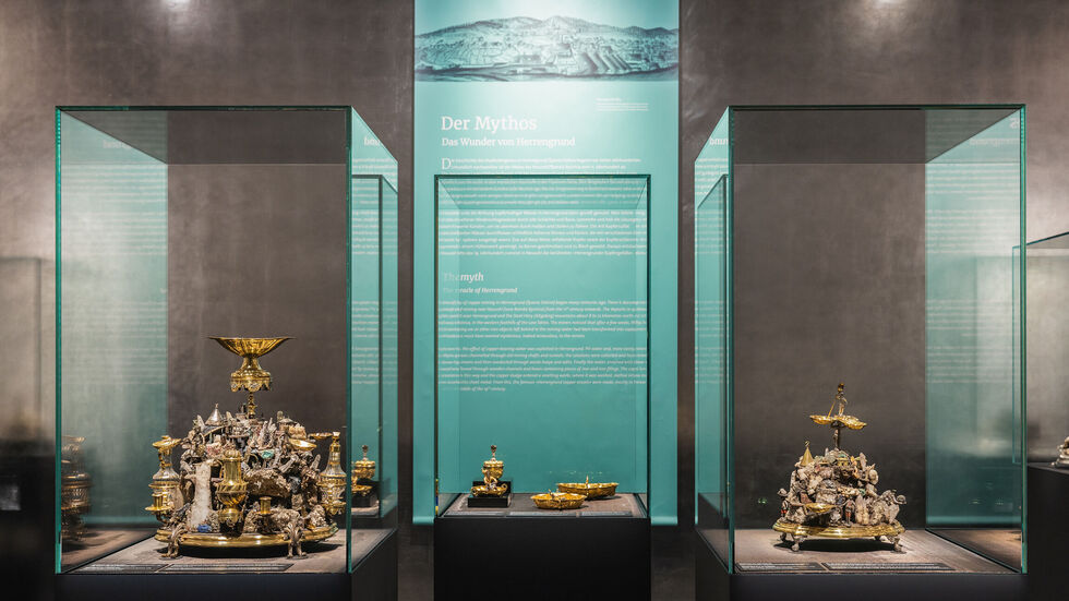 Die mehr als 70 Exponate beleuchten den chemischen Prozess, bei dem sich Eisengegenstände unter Tage in Kupfer verwandelt haben - das Rote Gold. Gezeigt wird außerdem aufwendig gestalteter Tischschmuck, den Kunsthandwerker mit vergoldeten Mineralien verziert haben.