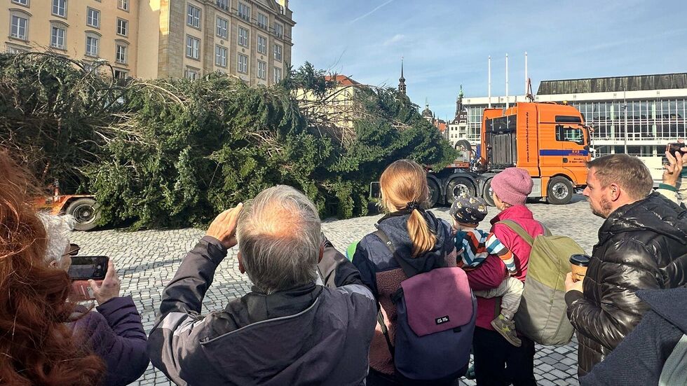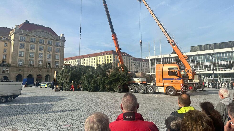 Hunderte Schaulustige versammelten sich auf dem Altmarkt, um das Spektakel zu verfolgen. Eigentlich sollte der Baum zwischen 10 und 11 Uhr eintreffen. Es gab allerdings ein paar Hindernisse auf dem Weg, unter anderem ein falschparkendes Auto. Das Fahrzeug musste erst weggefahren werden.