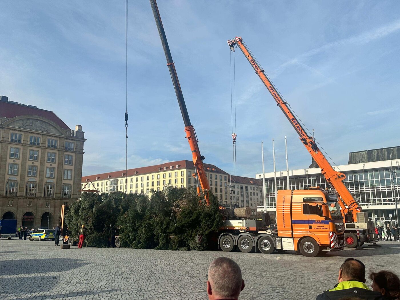 Dresden hat seinen Baum für den 591. Striezelmarkt! Mit dreistündiger Verspätung ist die Striezelmarkt-Tanne am Samstag gegen 13:30 Uhr im Dresdner Zentrum angekommen.