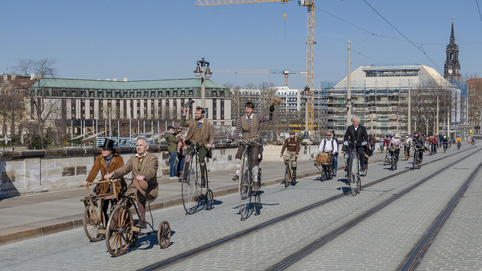 Mit historischen Rädern und passenden Gewändern rollten die Fahrrad-Veteranen-Freunde Dresden und der Radfahrerverein Weinböhla mit ihren historischen Fahrrädern sowie passend historischen Gewändern am Samstagmittag über die Augustusbrücke. Gemeinsam mit dem Fahrradclub ADFC wollten sie den breiten Raum für den Radverkehr auf der zentralen Elbquerung genießen.