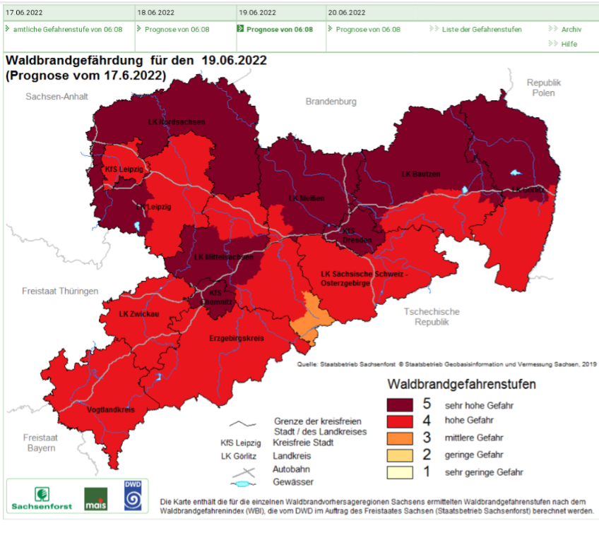 In der Dresdner Heide, in den Wäldern in Dresden und auch in den Wäldern im Landkreis Meißen wird die Lage am Wochenende brenzlig. Sachsenforst erwartet aufgrund der langen Trockenheit und der extremen Hitze die höchste Waldbrandstufe 5 in den nördlichen Teilen des Freistaates.