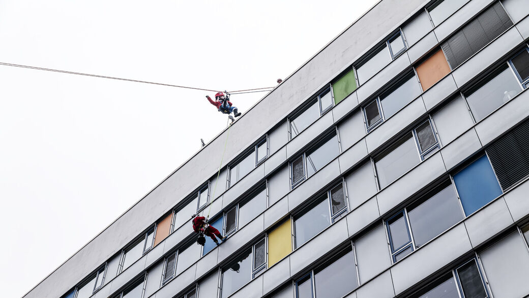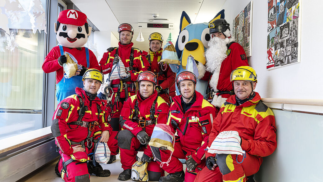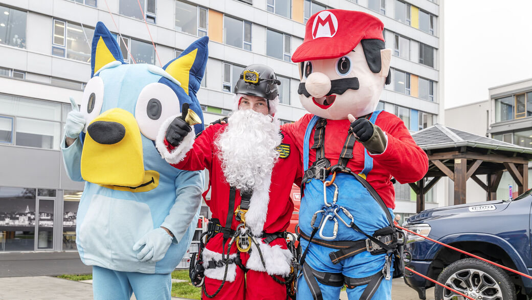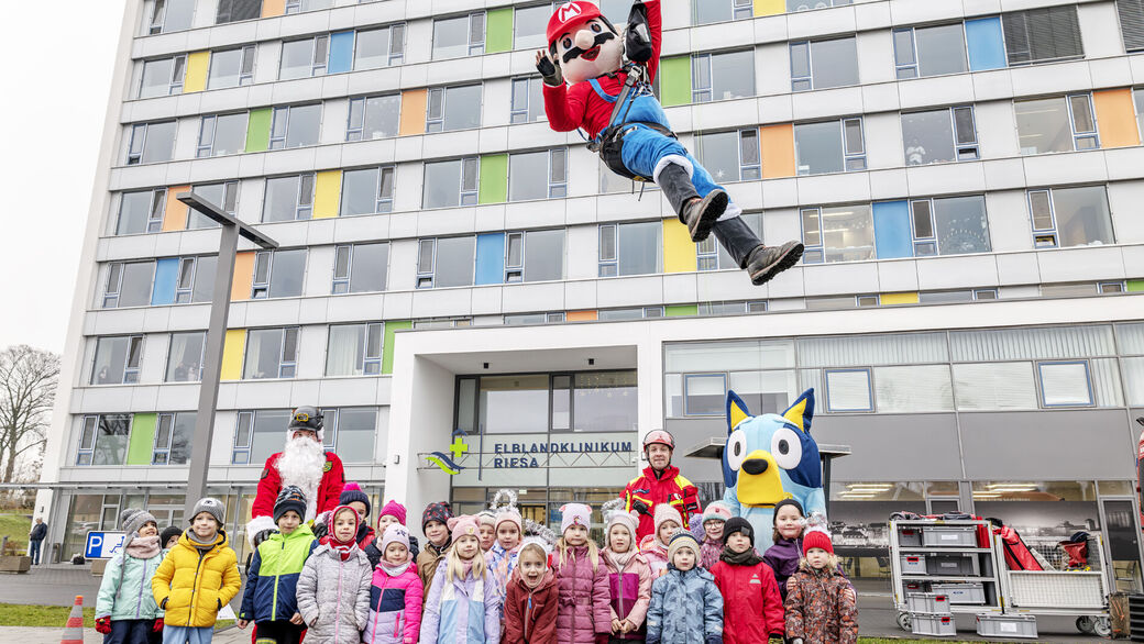 Ein Höhenretter seilte sich als Weihnachtsmann verkleidet an der Fassade des Klinikums ab. Auch der Verwaltungsdirektor der Klinik, André Gubsch, wagte sich als Super Mario an die Seile. Vom Dach ging es für ihn 30 Meter in die Tiefe.