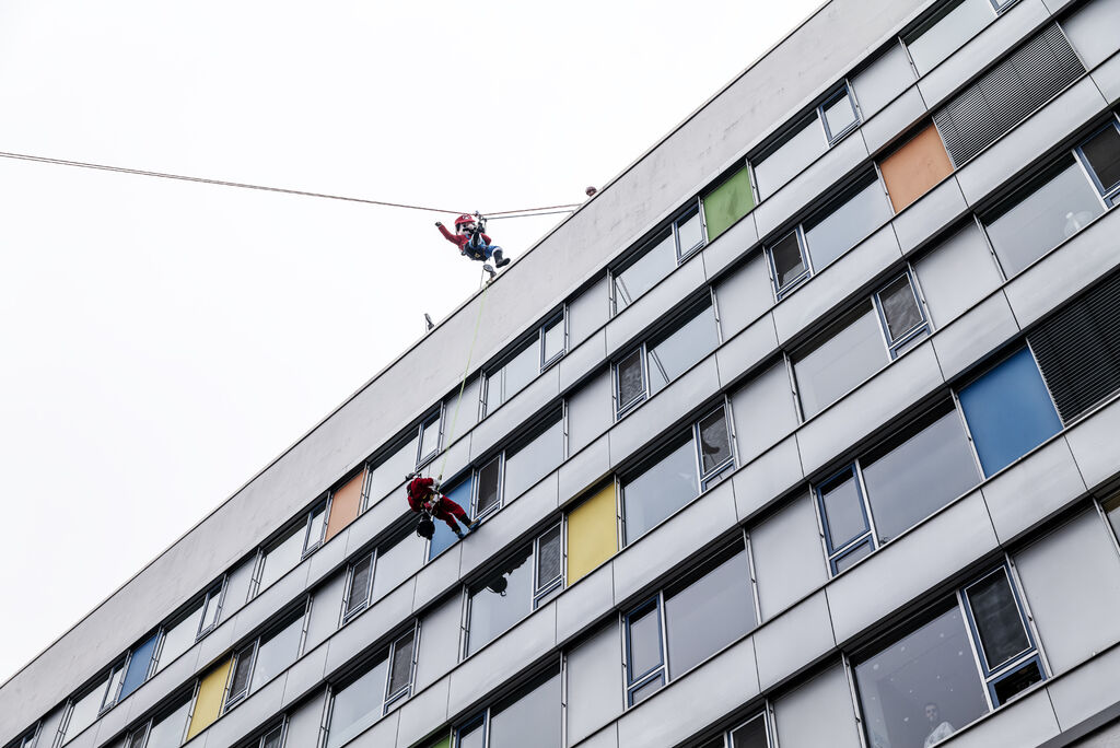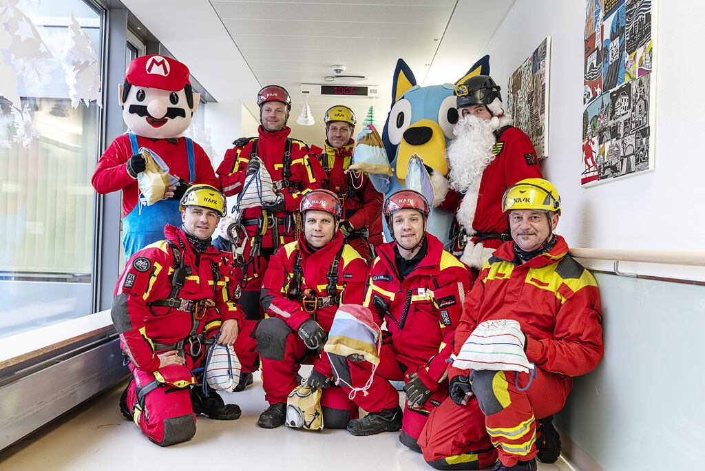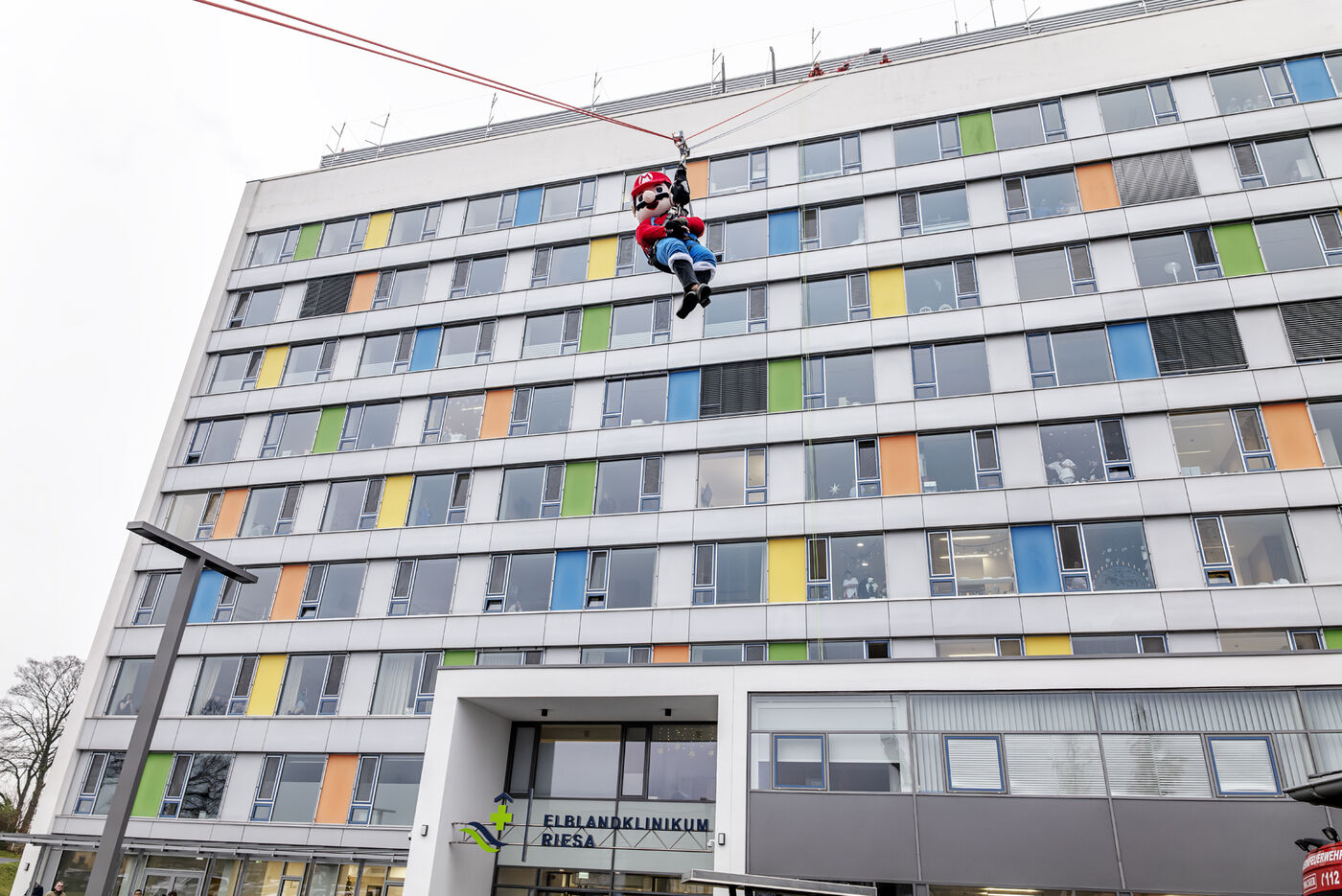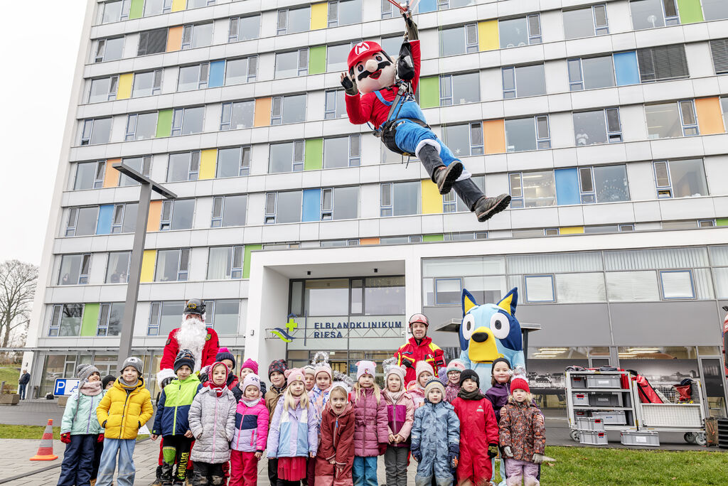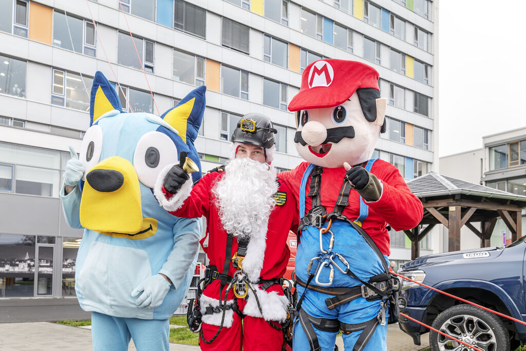 Ein Höhenretter seilte sich als Weihnachtsmann verkleidet an der Fassade des Klinikums ab. Auch der Verwaltungsdirektor der Klinik, André Gubsch, wagte sich als Super Mario an die Seile. Vom Dach ging es für ihn 30 Meter in die Tiefe.