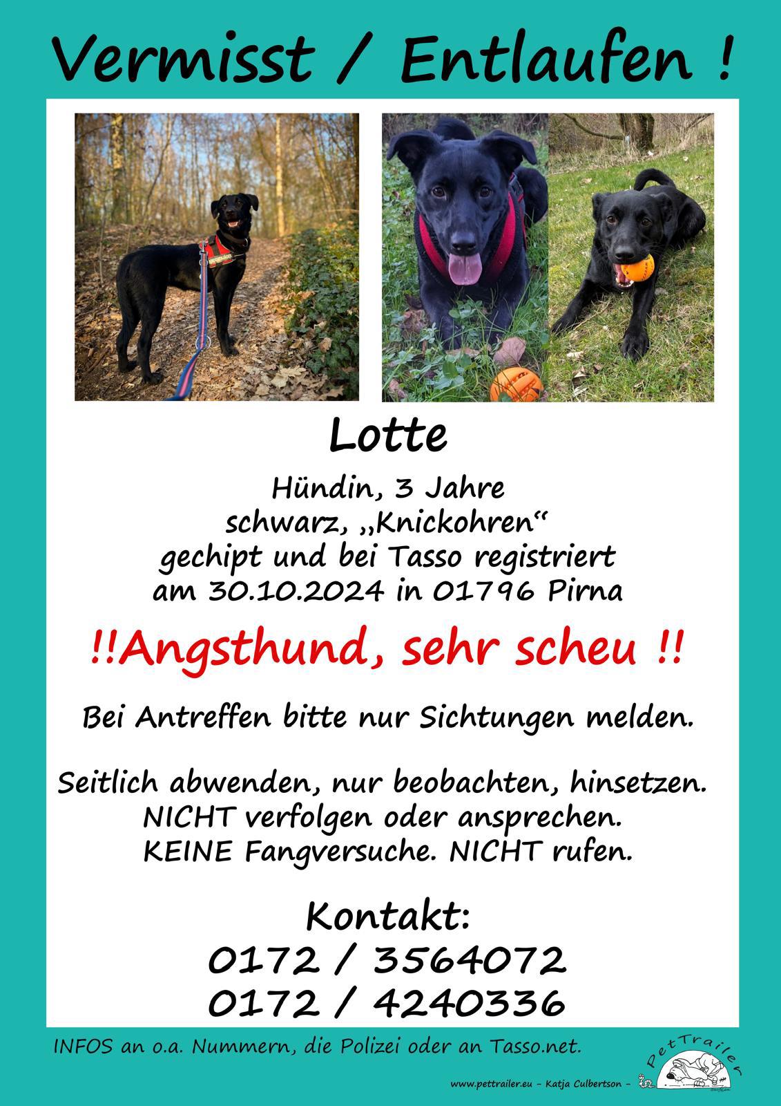 In Pirna wird „Lotte“ vermisst. Wer den Hund sieht, meldet sich am besten bei den Besitzern, denn das Tier ist scheu und läuft sofort weg.