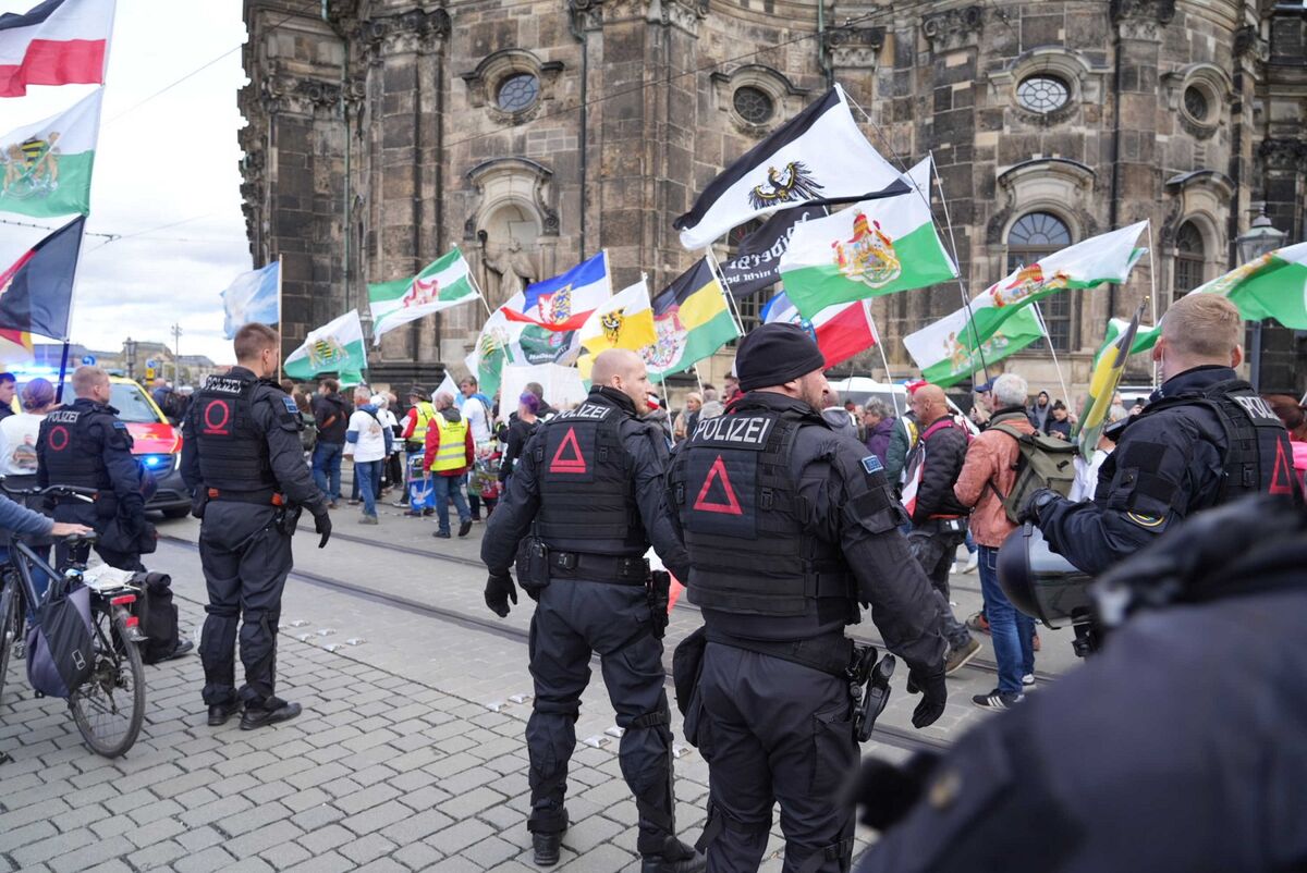 Hunderte Menschen haben am Sonnabend in Dresden gegen eine Versammlung der „Querdenken“-Szene demonstriert, die auch von sogenannten Reichsbürgern und den rechtsextremen Freien Sachsen unterstützt wurde.