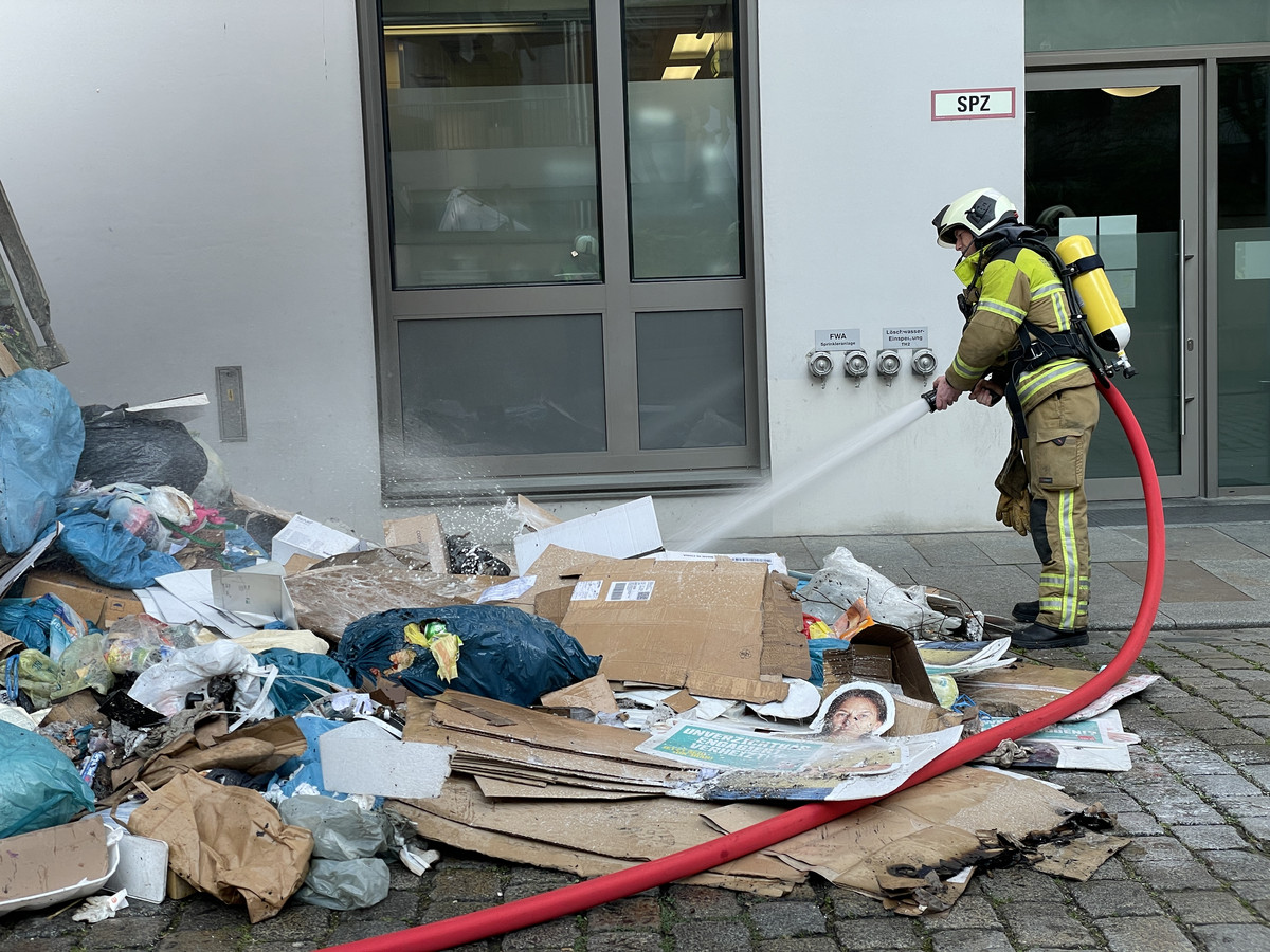 Als die alarmierte Feuerwehr eintraf, hatte die Besatzung bereits den kompletten Inhalt des Fahrzeugs auf die Straße gekippt. Auf einer Fläche von etwa zwei Quadratmetern war der gesamte Inhalt verkohlt. Mit einem Strahlrohr wurde der Rest gelöscht.