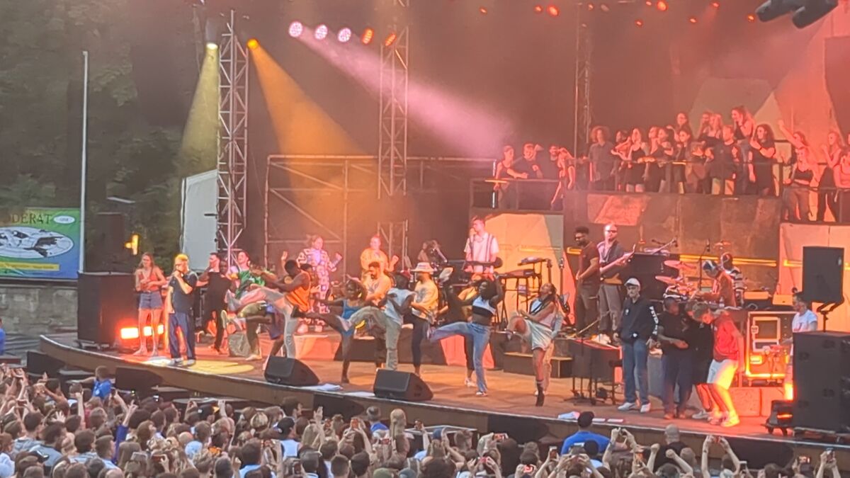 Zusätzlich zu seiner Crew durften Dresdner Fans den ganzen Abend mit auf der Bühne tanzen. Während des Konzerts holte Fox noch weitere Menschen aus dem Publikum nach oben. Der warme Sommerabend entwickelte sich zu einer Mega-Tanzparty. Zu bekannten Titeln wie „Stadtaffe“, „Schwarz zu blau“, „Alles neu“ oder „Zukunft Pink“ zeigten sich die Besucher in der Jungen Garde ziemlich textsicher. Aber auch andere Stücke vom neuen Album „Love Songs“ kamen gut an.