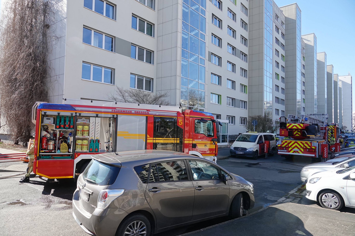 Die Feuerwehr durchsuchte unter Atemschutz die Räume nach der Person und dem Brandherd. Schwarz Qualm hatte sich mittlerweile in mehreren Wohnungen des Hochhauses und dem Aufzugsschacht verteilt. Insgesamt zehn Personen wurden von den Einsatzkräften gerettet und temporär in einem Bus der Dresdner Verkehrsbetriebe untergebracht. Eine dreiköpfige Familie wurde mit dem Verdacht auf Rauchgasvergiftung ambulant versorgt. Im Keller wurde keine Person angetroffen.