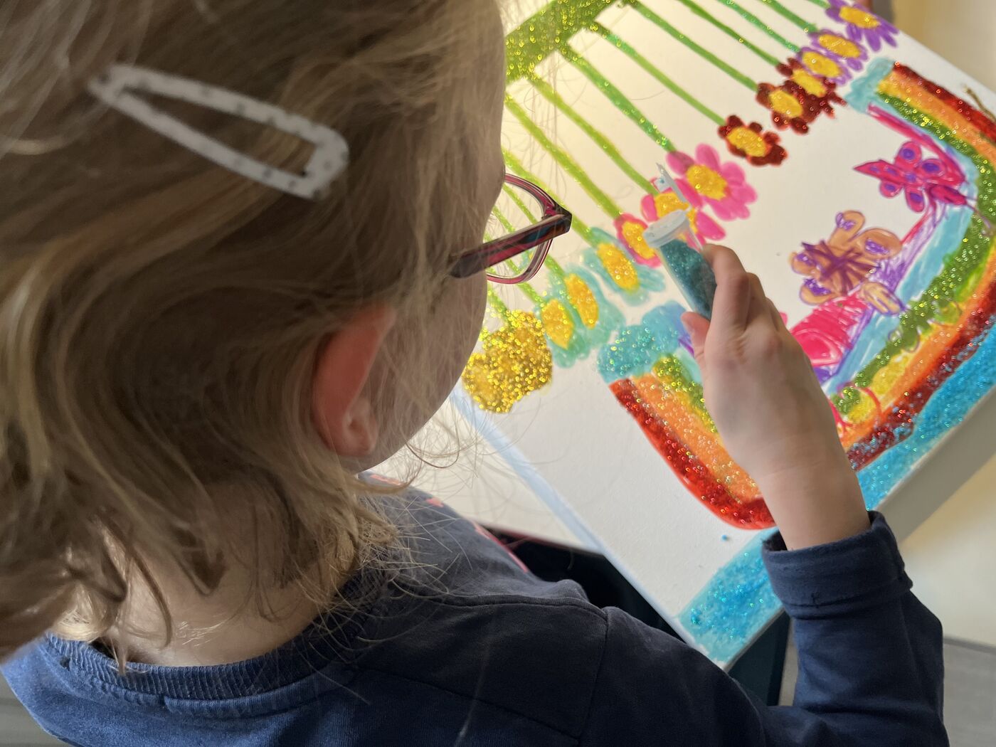 Die Kleine plappert munter drauf los: „Der Regenbogen führt zu einem Goldschatz. Als ich traurig war, hab ich den Regen gemalt, ohne Regenbogen.“ erzählt sie. Cordula Schild ist tiefenpsychologische Kunsttherapeutin und bestärkt das Mädchen. „Wir müssen nicht für alles Worte finden. Viele Gefühlslagen sind noch zu präsent und die Kinder auch noch viel zu klein. Bei der künstlerischen Arbeit mit verschiedenen Materialien, Farben und Werkzeugen werden Gefühle sichtbar und können besser verarbeitet werden.“