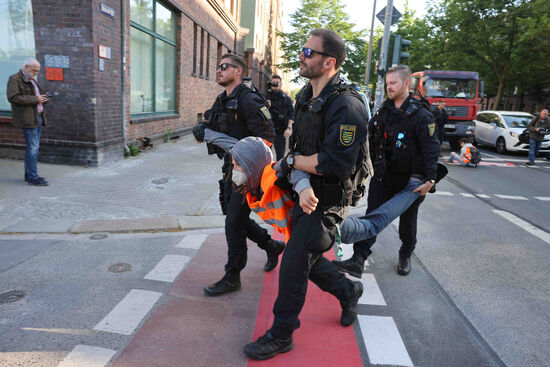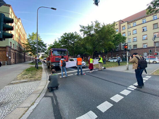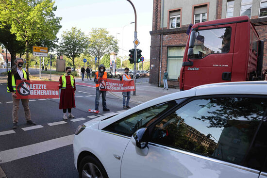 Insgesamt waren vier Demonstranten, eine Frau (16) und drei Männer (22,24,40), vor Ort. Zwei der Männer hatten sich an der Straße angeklebt. Im Verkehr gab es zunächst starke Behinderungen. Auch ein Polizeihubschrauber war im Einsatz.