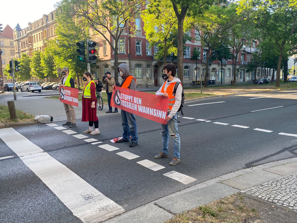 Demonstranten der Klimaschutz-Gruppe „Letzte Generation“ haben in Dresden am Montagmorgen die Hansastraße nahe des Bahnhofs Neustadt stadteinwärts blockiert. Mit Bannern protestierten sie u.a. gegen neue Öl-Bohrungen in der Nordsee und forderten den Ausbau von Wind- und Solarenergie.
