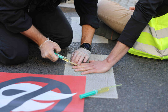 Knapp eine Stunde später war die Versammlung bereits wieder beendet. Die Fahrbahn konnte um 8.20 Uhr wieder freigegeben werden. Die beiden angeklebten Teilnehmer wurden von der Polizei losgelöst. Laut unserem Reporter vor Ort verwendeten die Beamten dafür Olivenöl. Die weibliche Teilnehmerin entfernte sich freiwillig von der Straße, ein anderer wurde weggetragen.