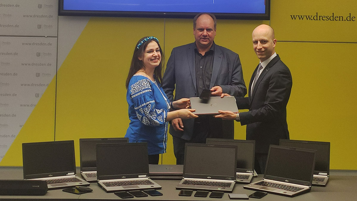 - Liliaa Diriavka vom Koordinierungszentrum für Ukraine-Flüchtlinge, Dresdens Oberbürgermeister Dirk Hilbert (M.) und Dennis Schulz, Geschäftsführer von der Firma Linde bei der Übergabe der Laptops und Handys am Montag in Dresden.