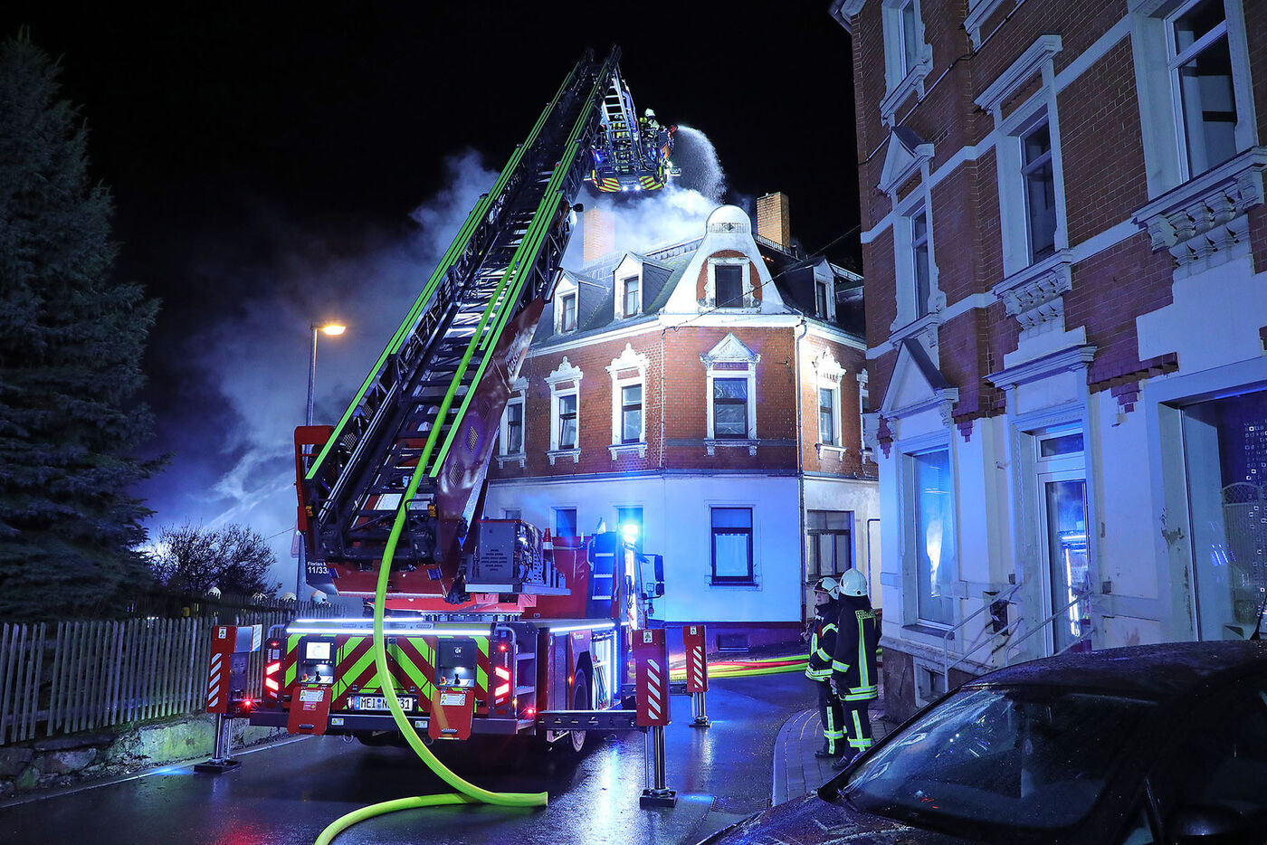 In Großschirma bei Freiberg musste die Feuerwehr einen komplizierten Dachstuhlbrand löschen. Am Markt stand am späten Mittwoch Abend das Dach eines Wohnhauses in Flammen, so unser Reporter.