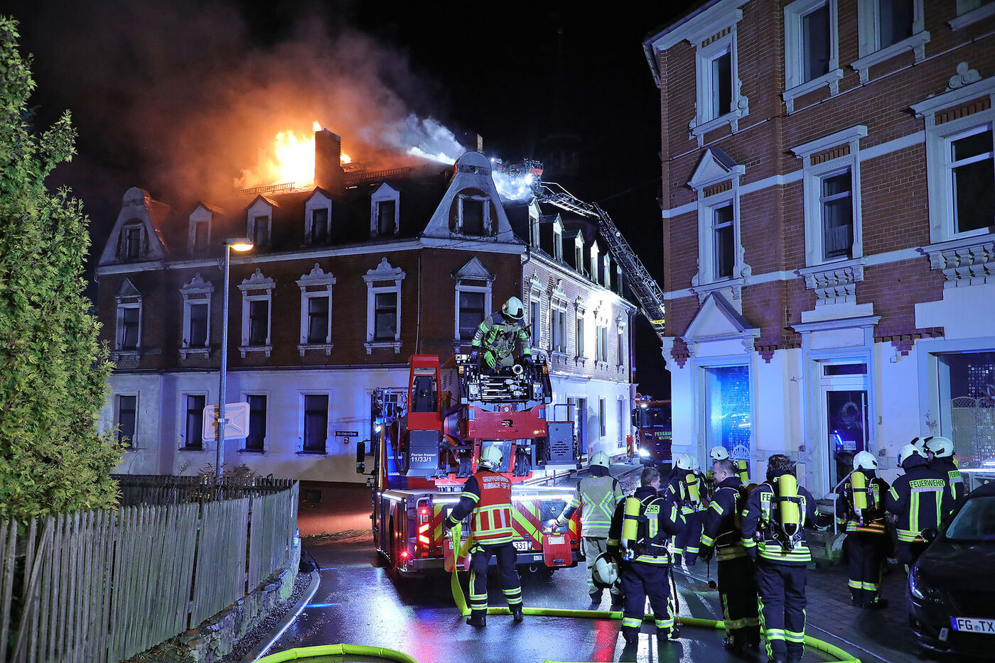 • Gegen 23 Uhr rückte die Feuerwehr zu dem brennenden Gebäude am Markt in Siebenlehn aus