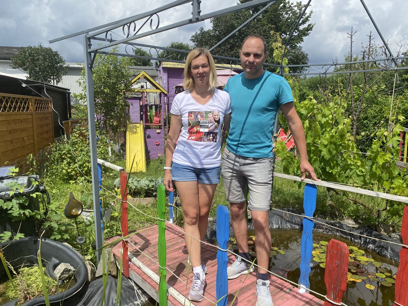 - Fühlen sich verleumdet: Olga (40) und Juri Matei (48) in ihrer Parzelle der Kleingartenanlage "Brandts Aue" im Leipziger Stadtteil Gohlis-Süd.