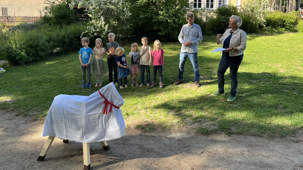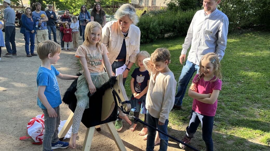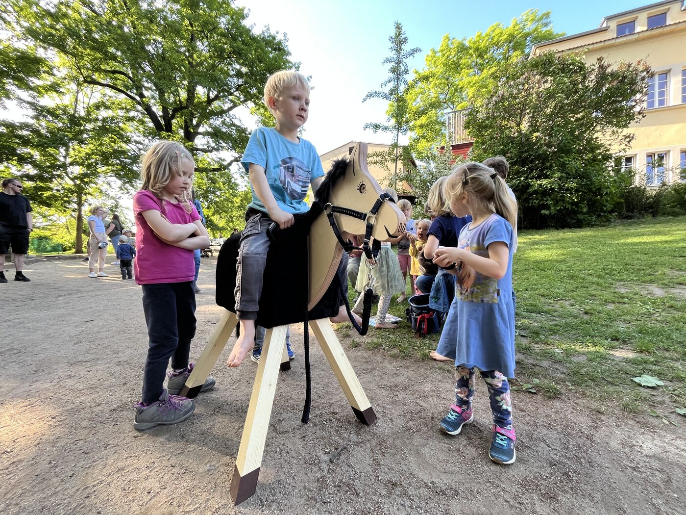 „Da steht ein Pferd auf dem Flur“ heißt es ab jetzt im Ökumenischen Kindergarten Meißen. Die Initiative „Pferde für unsere Kinder e.V.“ hat bundesweit 10.000 Holz-Lernpferde für Kitas bereitgestellt. Das erste sächsische Kita-Lernpferd ist jetzt in Meißen eingezogen. Alexandra Gerlach / Prinzessin zur Lippe ist Schirmherrin des Ökumenischen Kindergartens und glaubt fest an das Pferd als Lehrmeister.