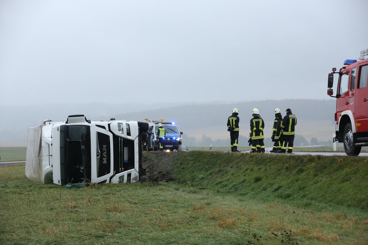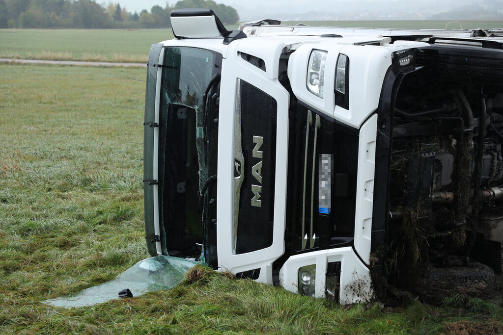Ein mit Betonteilen beladener LKW ist am Montagnachmittag auf der B101 in Großschirma umgekippt. Laut den Informationen unseres Reporters geriet der Sattelzug am Ortseingang ins Schleudern. Daraufhin rutschte der Wagen in den Graben und kippte um.
