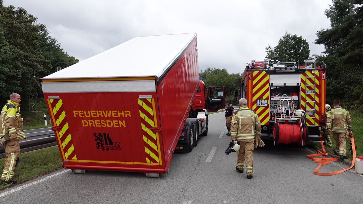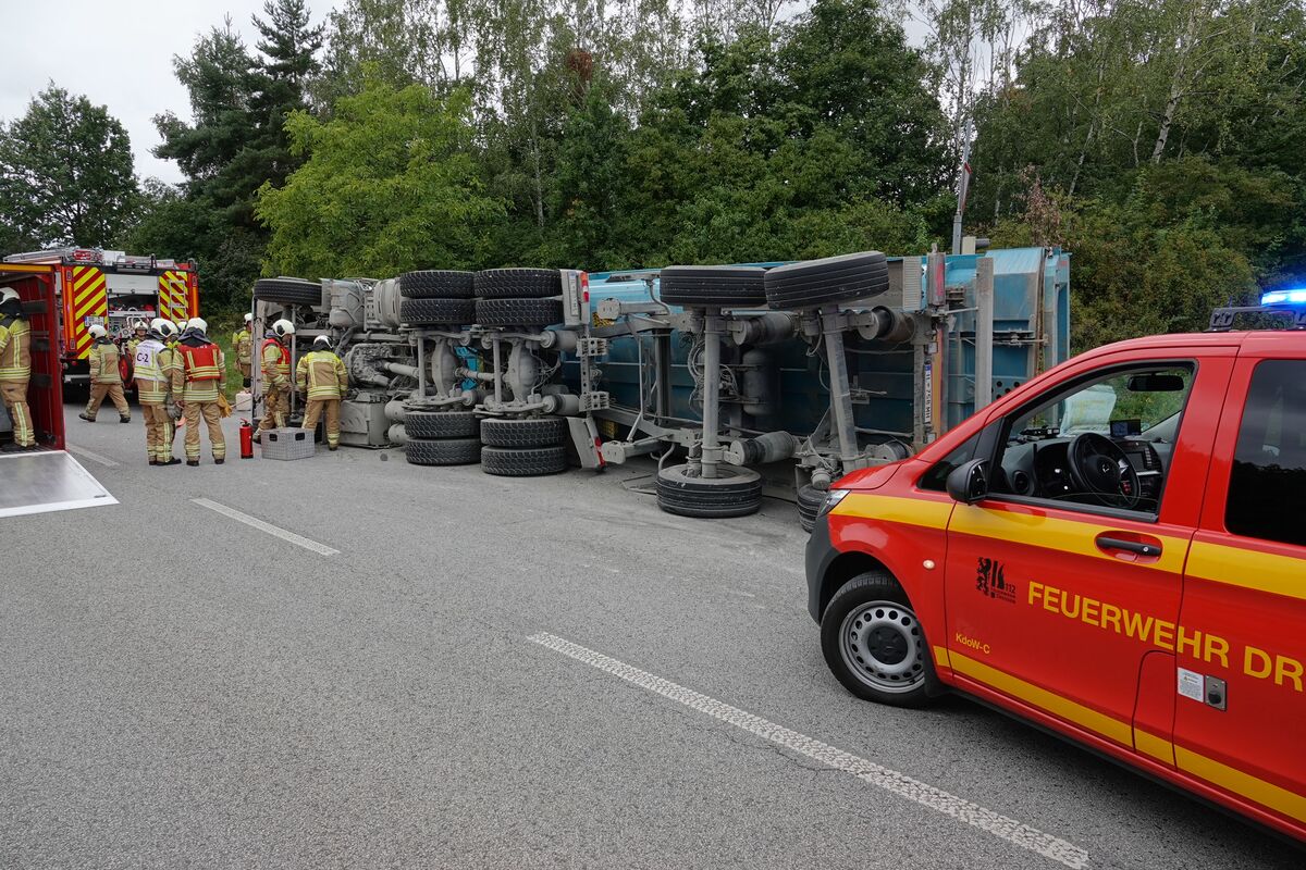 LKW kippt in Autobahnauffahrt Dresden-Flughafen um