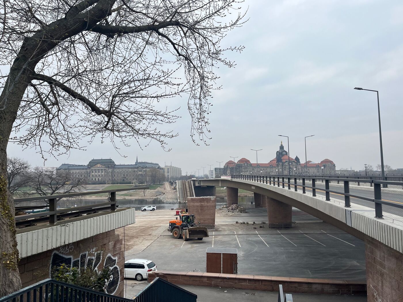 - Vom Altstädter Ufer auf die Reste der Carolabrücke blickend, sind kaum Bauarbeiten zu sehen