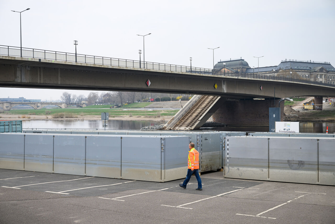 Der Aufbau der vier Schwerlast-Stützentürme auf den Pontons erfolge nun in der kommenden Woche. Die Pontonteile aus Tschechien liegen bereits am Altstädter Ufer bereit. Von dort aus werden sie in der kommenden Woche mit den Stütztürmen in die Elbe gelassen und unter das Gelenk der beiden noch stehenden Brückenzüge gefahren, wie Prüfer erläuterte. Sie fangen dann eine Last von 1400 Tonnen ab. In der Zwischenzeit stünden auch noch Genehmigungen des Wasser- und Schifffahrtsamtes aus, erklärt Thomas Alscher, Chef von Hentschke Bau aus Bautzen, die den Brückenabriss leiten.