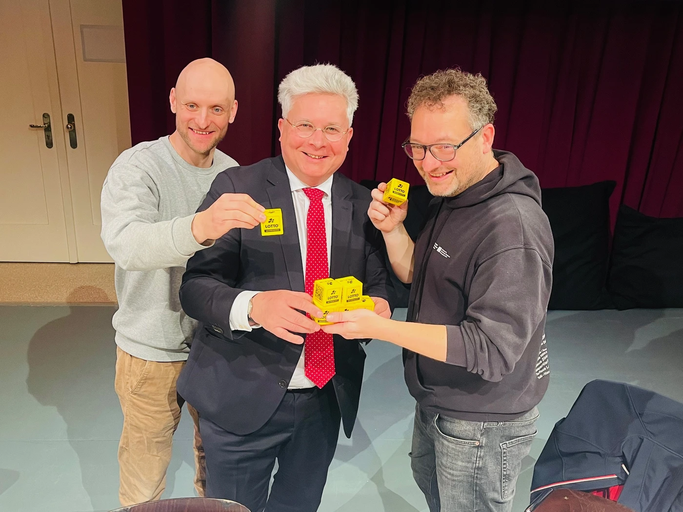 • Tänzer Philip Lehmann, Sachsen-Lotto-Chef Frank Schwarz und Andre Schellenberger vom Festpielhaus Hellerau (v.l.n.r.) feiern die neue Kooperation