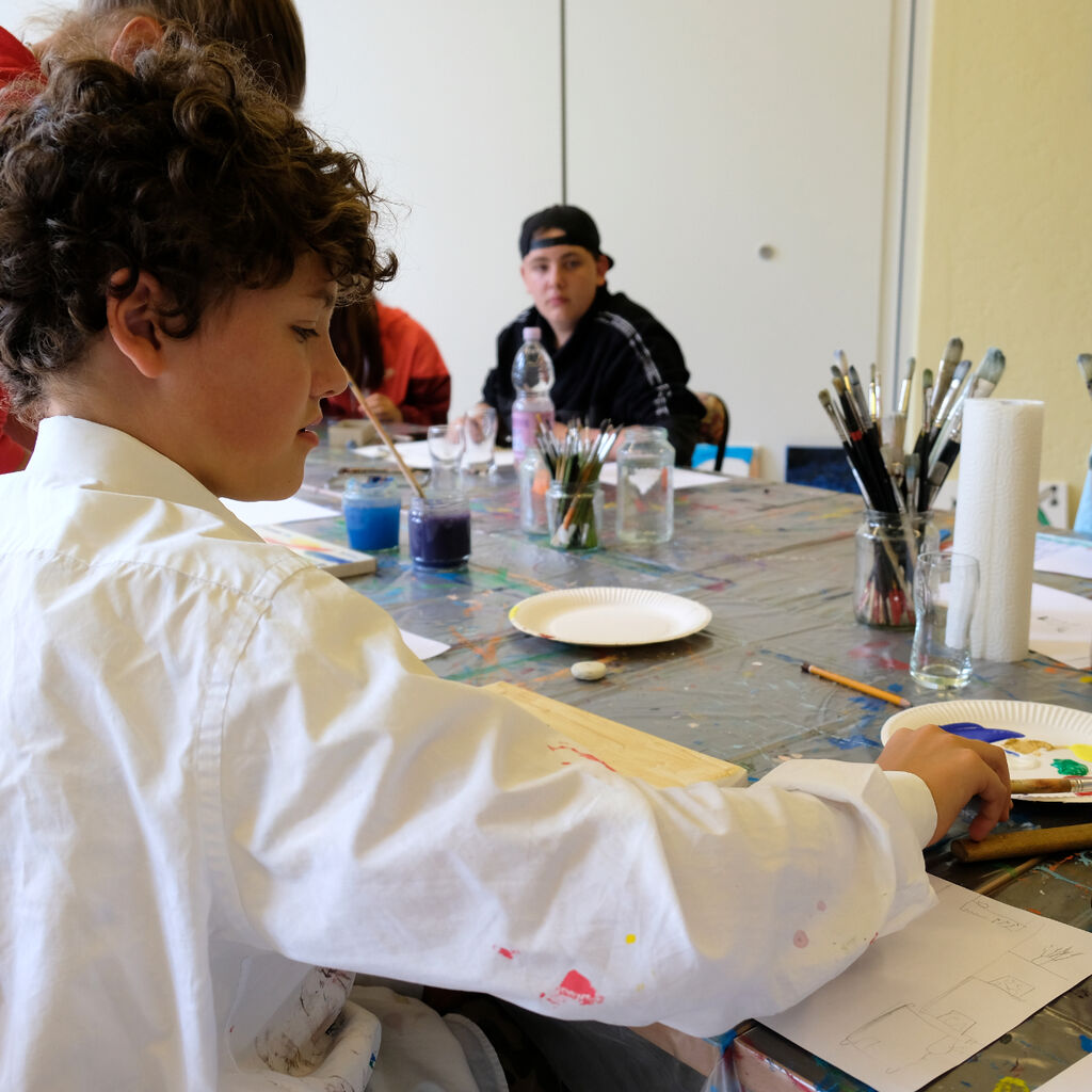 "Man kann hier einfach malen, was einem in den Sinn kommt", schwärmt Lion von dem Ferienangebot. Während ihn die Titanic fesselt, hat zum Beispiel der 13-jährige Jonas sein Gehirn auf der Leinwand festgehalten. Ein Star-Wars-Gefährt ist darin ebenso zu finden wie das Auge aus seinem Lieblingsfilm, aber auch eine Tür mit der Aufschrift "Nicht öffnen!" Maria aus dem Integrativen Familienwohnen dagegen hat ein abstraktes Bild geschaffen. "Ich schaue einfach, was auf der Leinwand entsteht, und lass mich von meinem Bild überraschen", sagt sie.