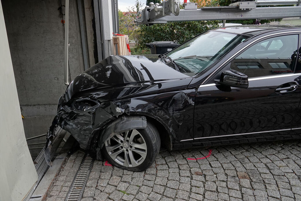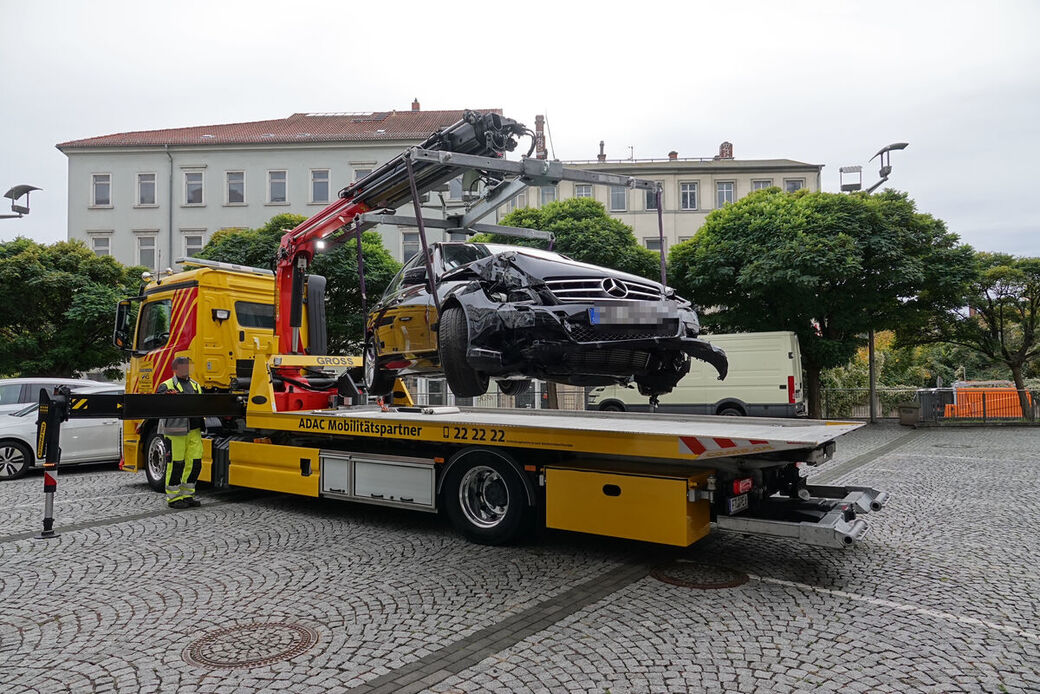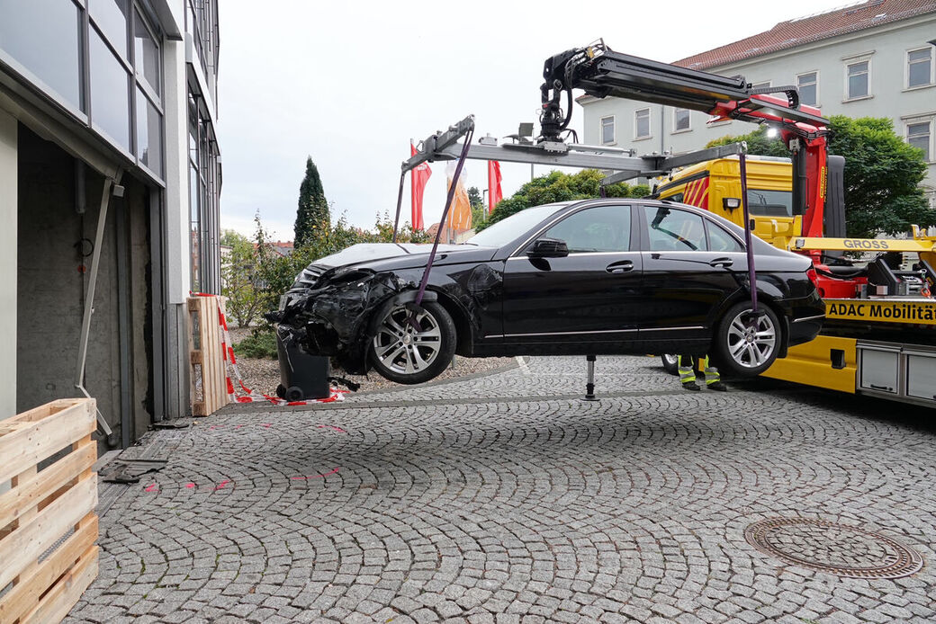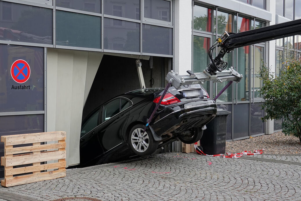 Meißen: Mercedes bleibt in Fahrstuhlschacht stecken