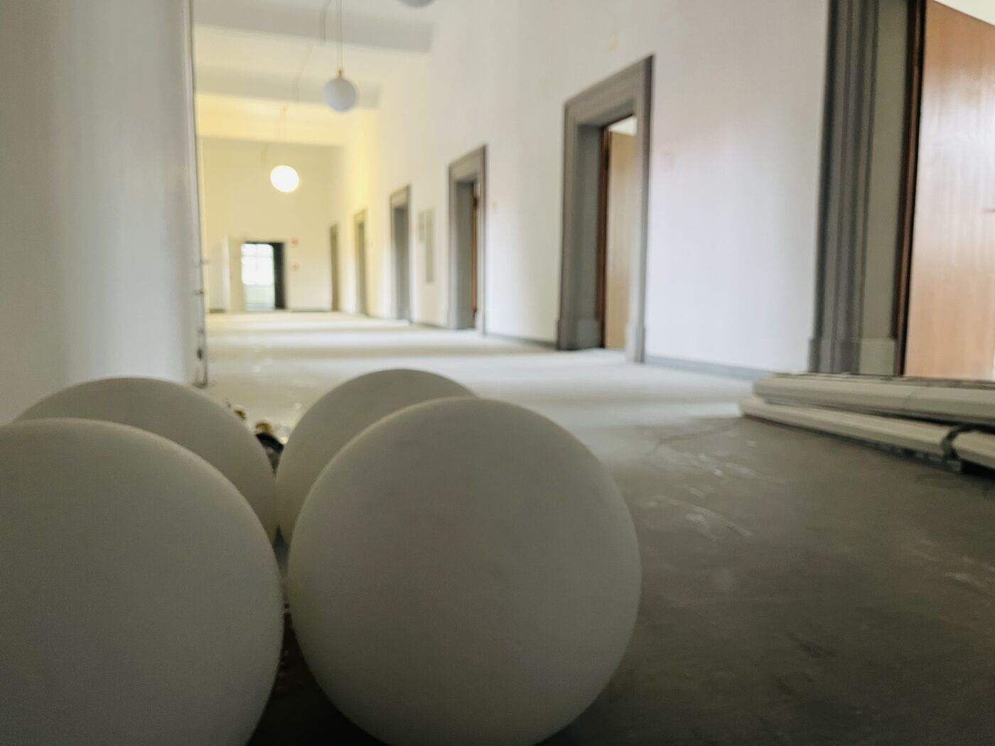 - Die denkmalgeschützten Kugellampen (li.) werden während der Sanierungsarbeiten gesichert und anschließend wieder angebracht