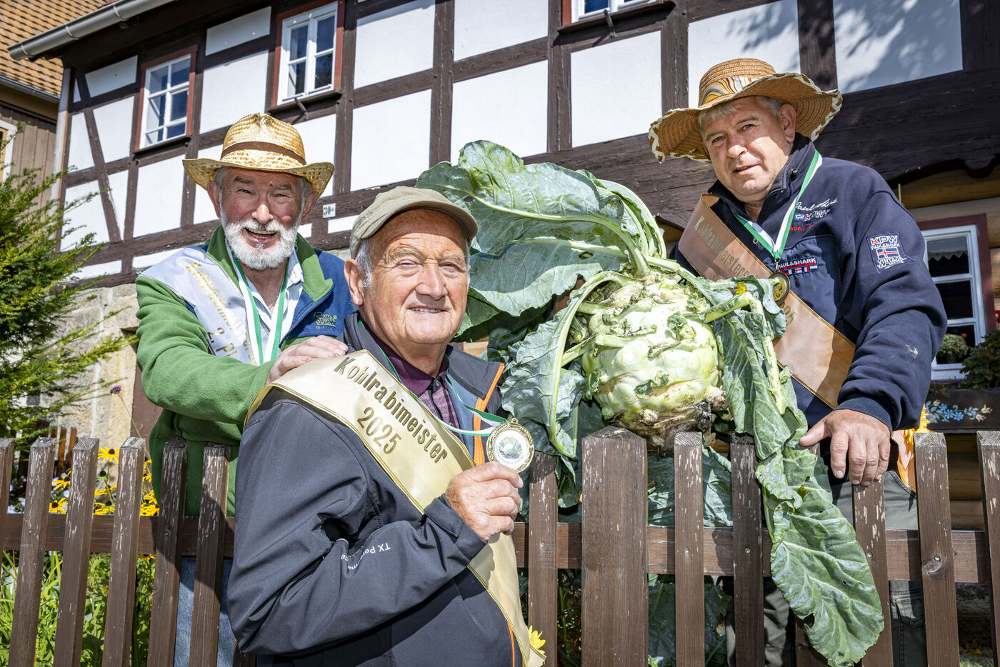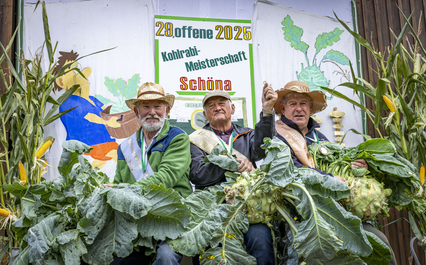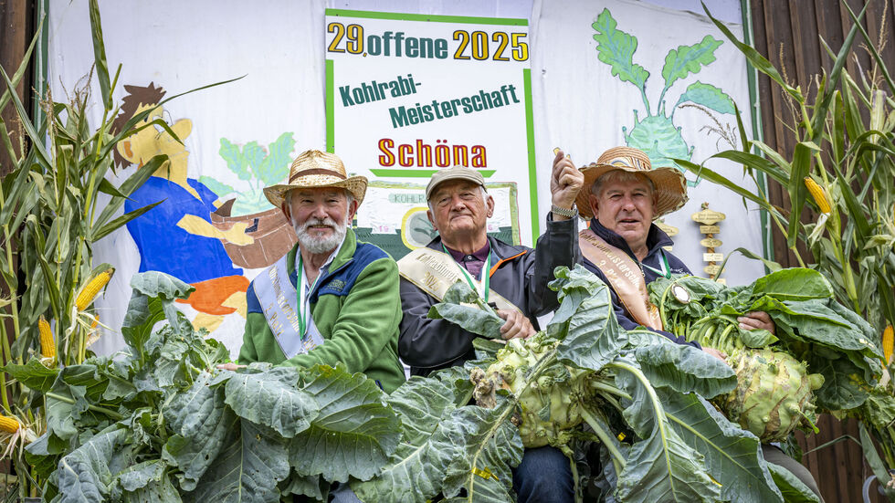 - Die Kohlrabisieger von 2025 v.l.n.r.: Platz 2: Harti Erler (78) aus Schöna, Joachim Hempel (77) aus Reinhardtsdorf mit der schwersten Knolle dieses Jahr und Frank Meißner (64) aus Reinhardtsdorf auf Platz 3