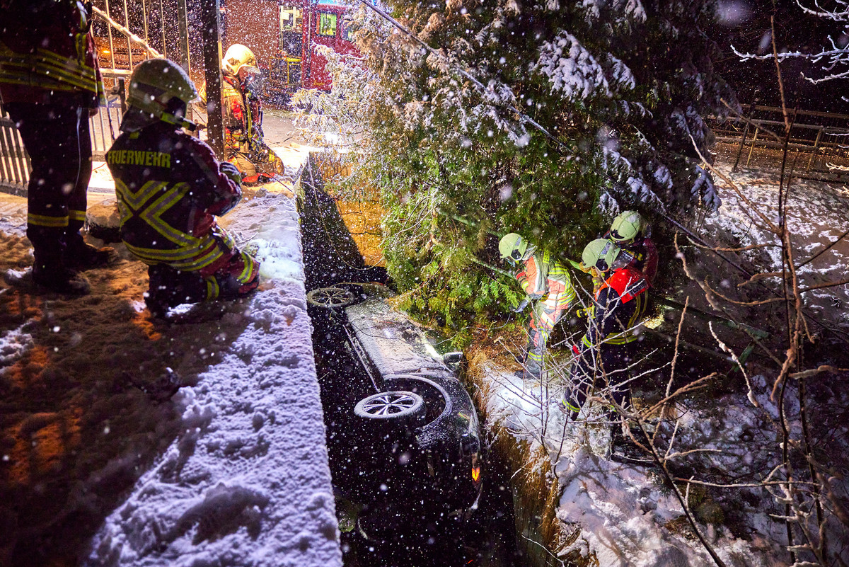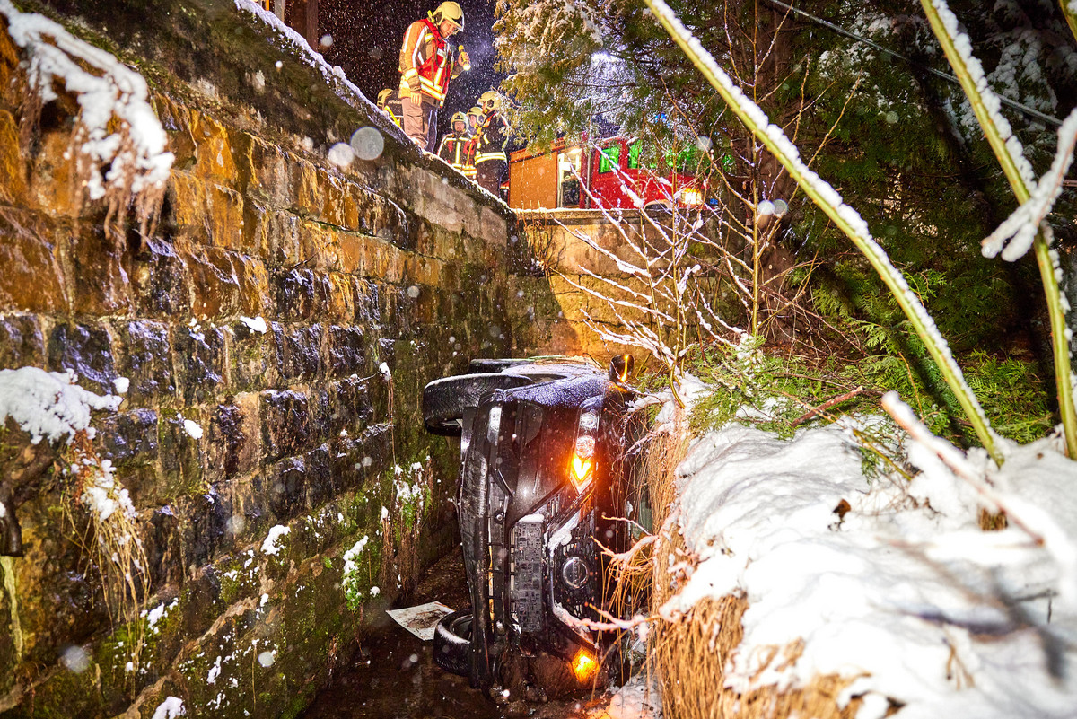 Ersthelfer holten die Fahrerin und ihr Kind aus dem Auto. Die Frau wurde nach Informationen der Polizei schwer verletzt. Ihre sechs Jahre alte Tochter wurde vorsorglich ins Krankenhaus nach Pirna gebracht. Das Auto wurde mit einem Kran aus dem Bach gehoben.