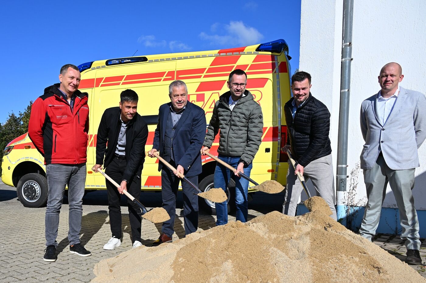- (v.l.n.r.): Gunnar Stary, Geschäftsführer bendl HTS; Oliver Thomas, Geschäftsführer Bauplanconcept Ingenieure GmbH; Landrat Michael Geisler; Alexander Penther, Geschäftsführer ASB; Alexander Sachse, Bürgermeister Neustadt i. Sa.; Paul Krell, Leiter ASB-Rettungsdienst