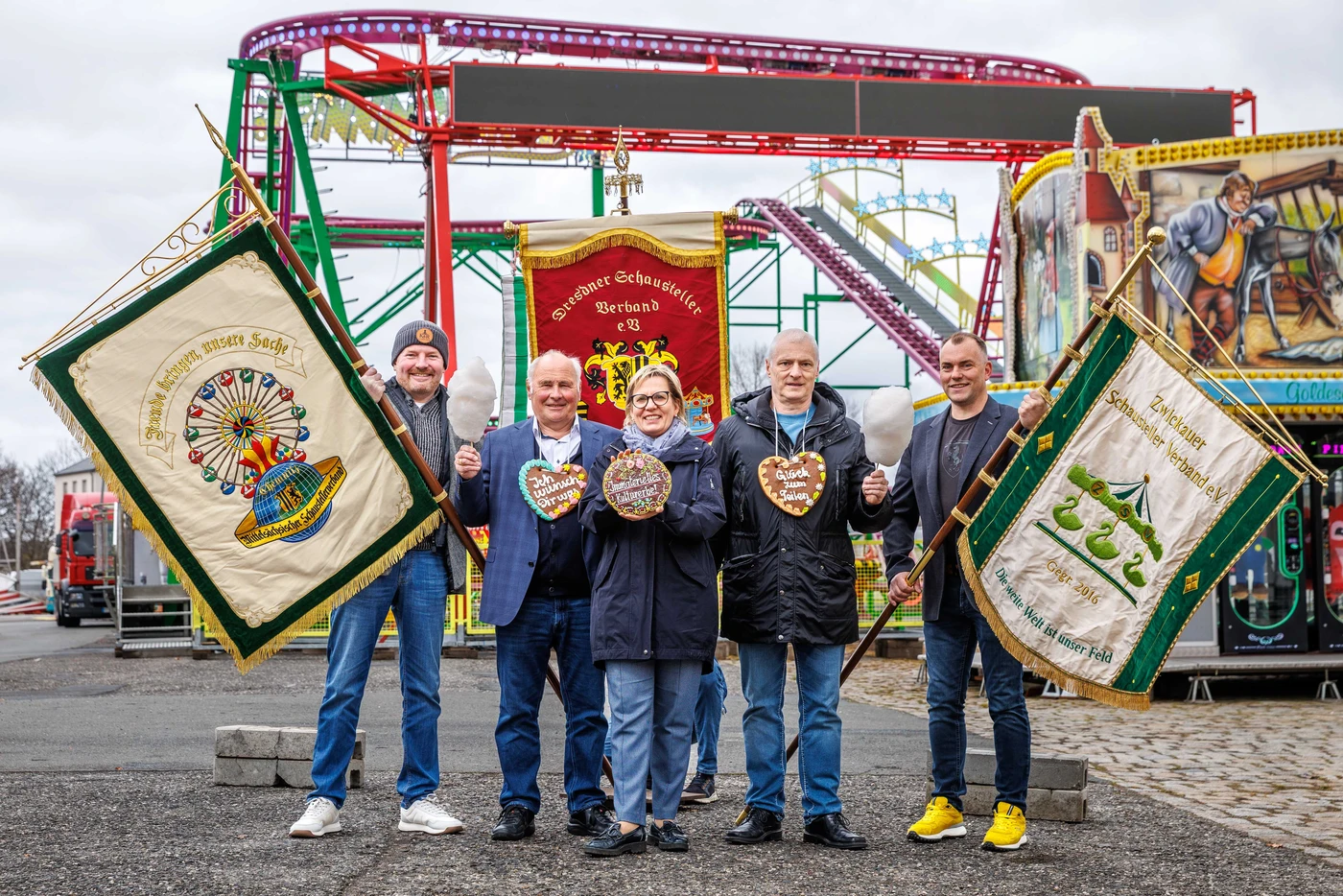 - Ministerin Klepsch inmitten der sächsischen Schausteller-Chefs auf dem Rummel an der Marienbrücke