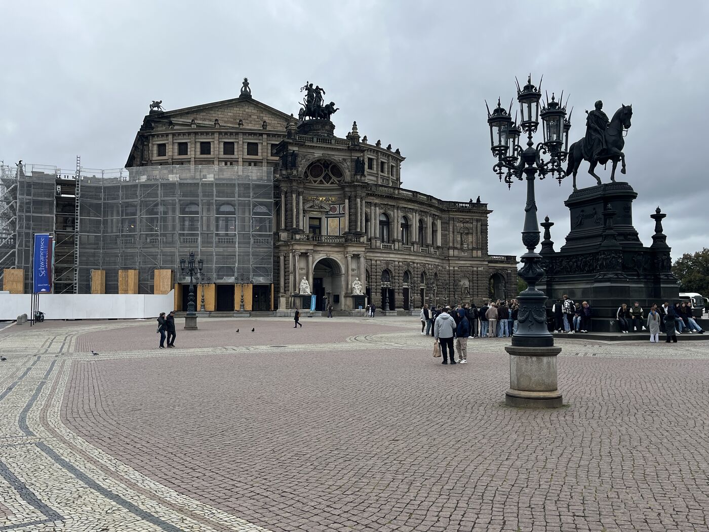 - Die Oper ist an der Seite Richtung Elbe mit Bauzäunen versperrt