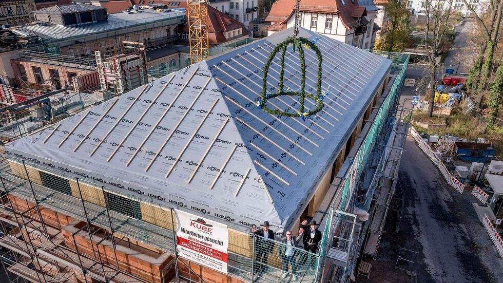 Am Dresdner Parkhotel ist der Dachstuhl der sanierten Villa Romy fertig - am Donnerstag wurde dem Bau die Richtkrone aufgesetzt. In die Räume soll künftig ein Dialysezentrum einziehen, im zweiten Obergeschoss entsteht eine Hoteletage.