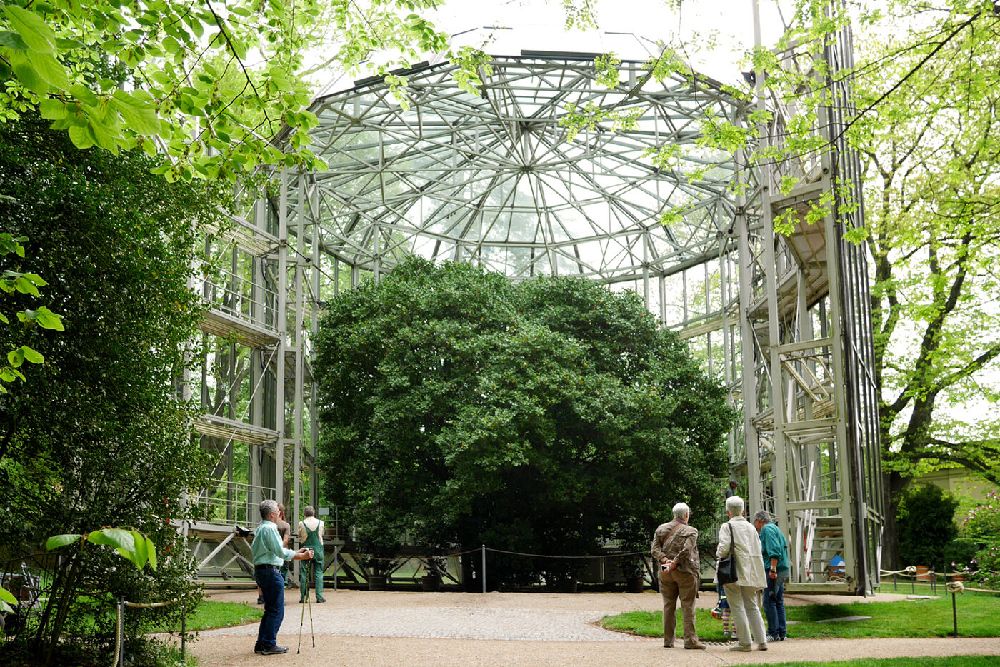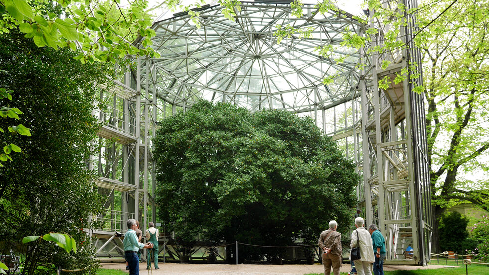 Die Pillnitzer Kamelie kommt wieder an die frische Luft. Am Mittwoch, den 11. Mai wird das fahrbare Glashaus neben die Kamelie geschoben. Das 13 Meter hohe und 54 Tonnen schwere Glashaus hatte die riesige Pflanze in den Wintermonaten vor den kalten Temperaturen geschützt.